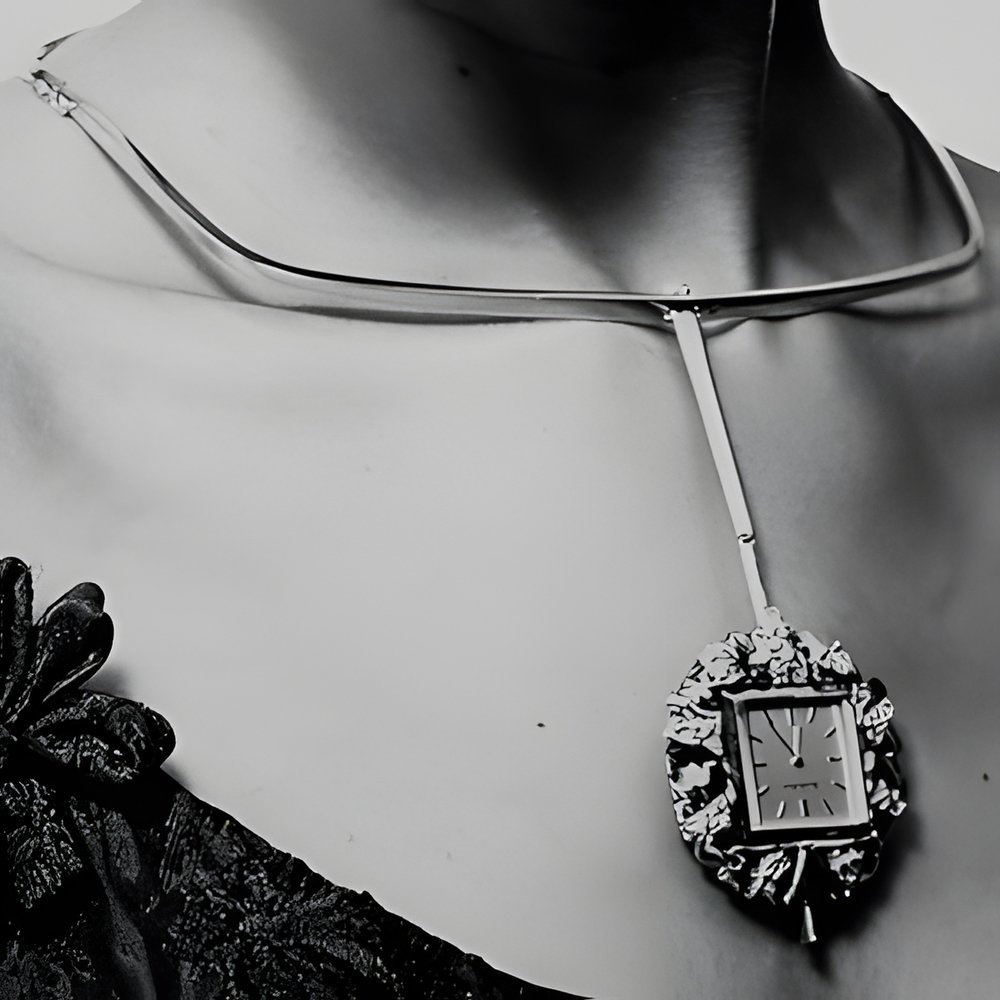 The watch pendant is always in fashion This up-to-the-minute model has some strikingly original features : the solid gold necklace shaped to the neck the wearer can lift the arm attached to the watch to see the dial which has been set upside down for easy reading. The case is exquisitely worked in native yellow, grey and pink gold. (BUECHE-GIROD)