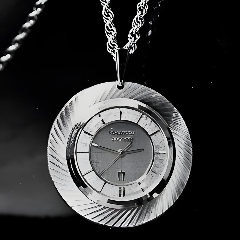 Further proof of the vitality of the fashion in pendants. This beautiful model is equipped with an electronic movement. Fashion note of special interest : the sun“theme adorning the grey gold case. The inverted watch dial makes it easy to read, (BULOVA”Accutron")
