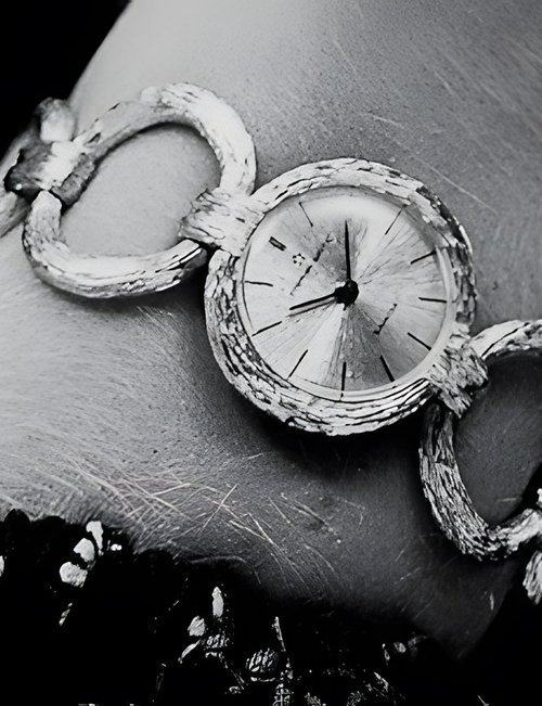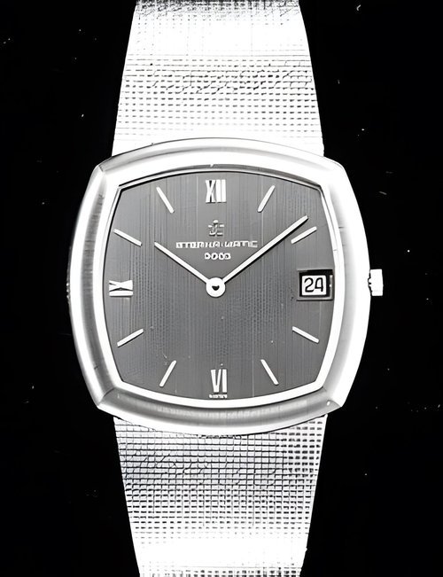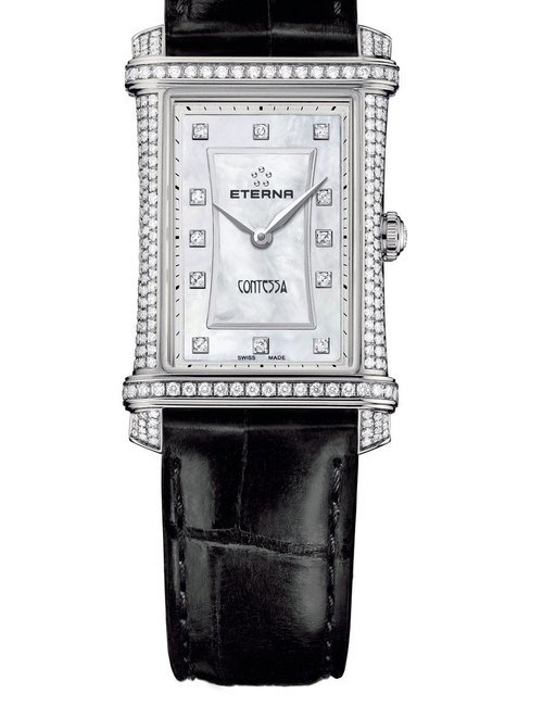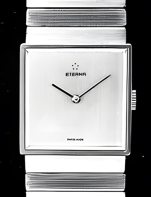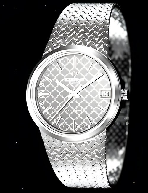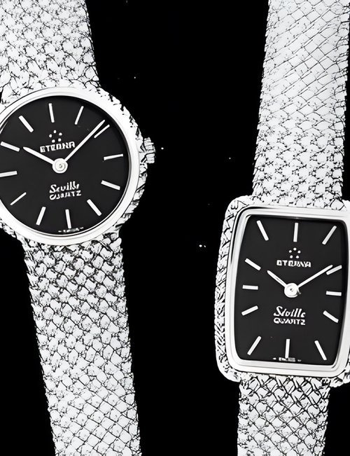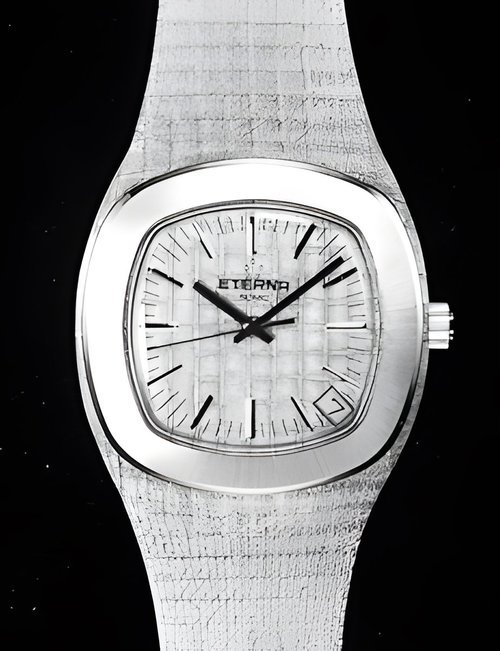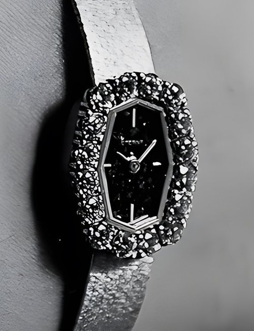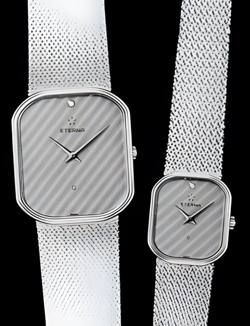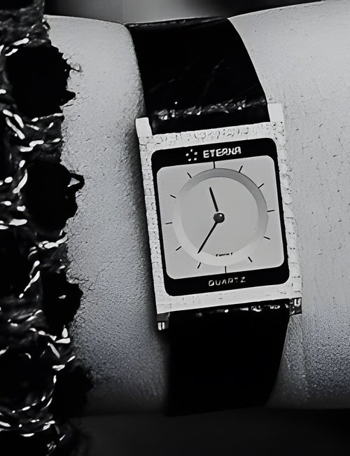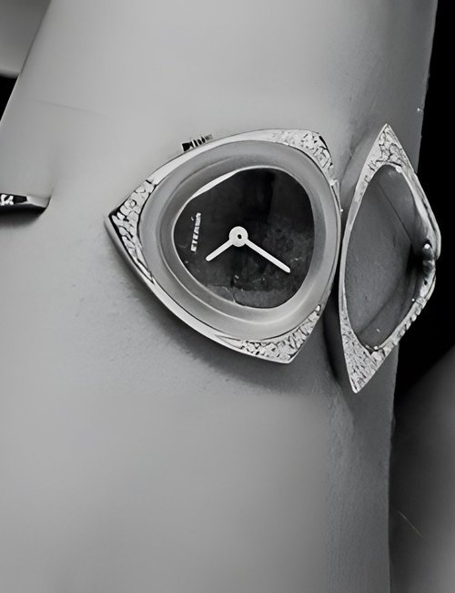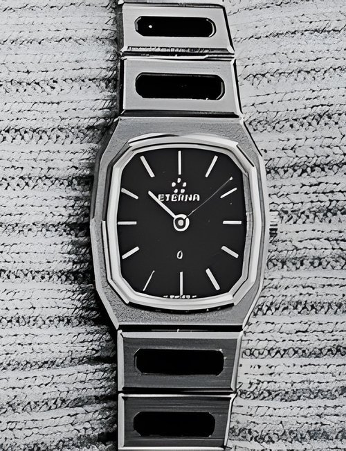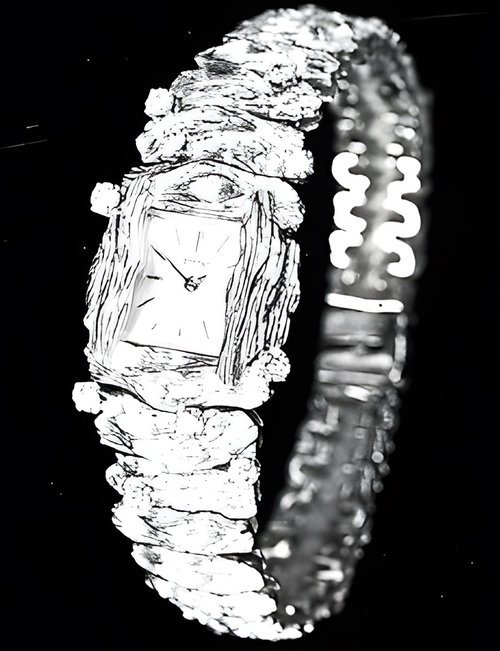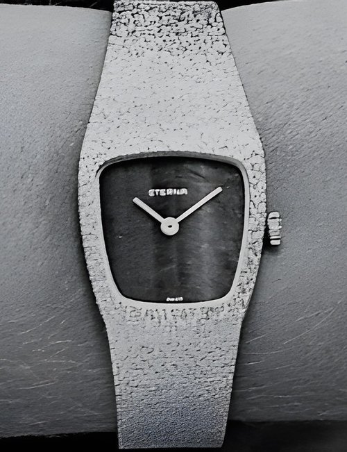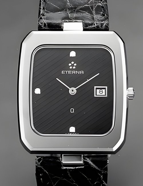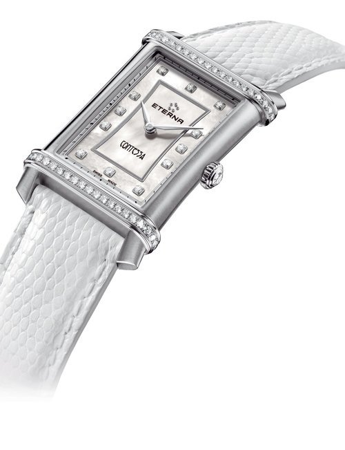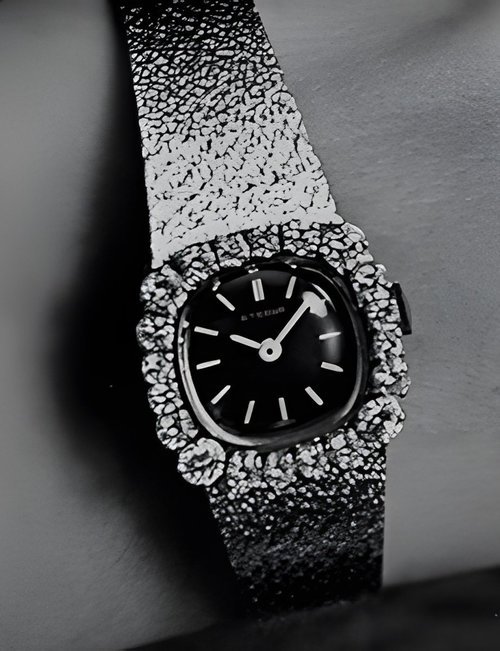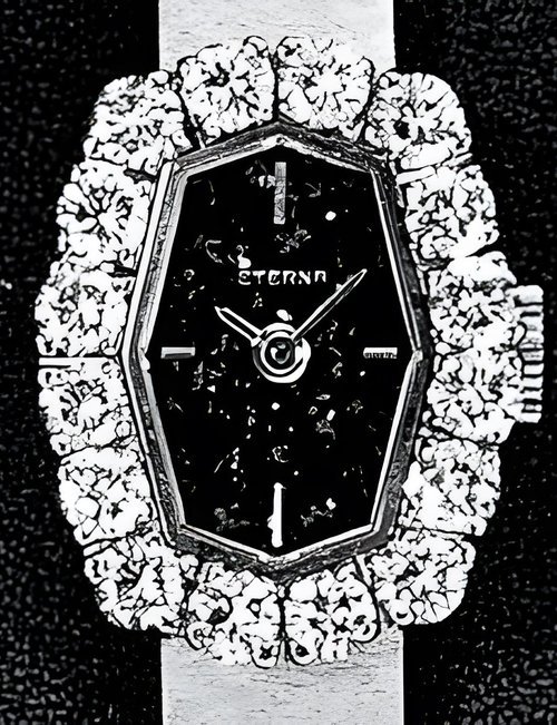 A splendid example of the “native gold” treatment , so much in the forefront of Switzerland’s watch styling at the present time. This jewellery watch is in l8ct yellow gold. The dial opening is in the "soft look’ styling, bt in the inverse sense - normally the case curves outwards. (ETERNA)