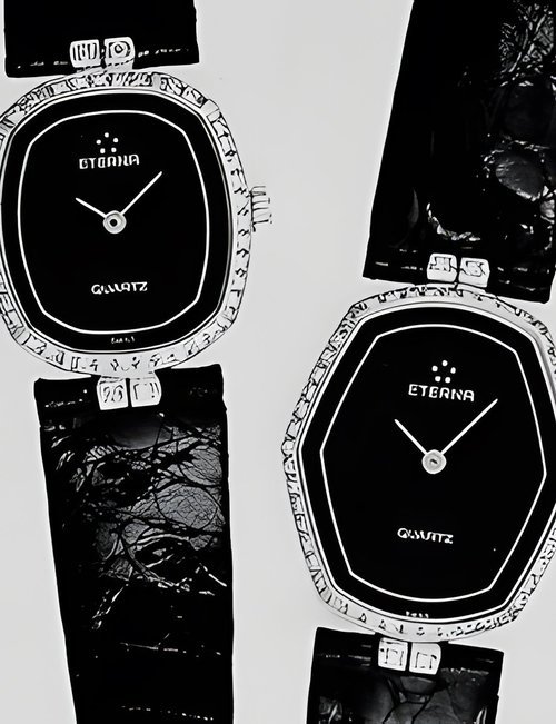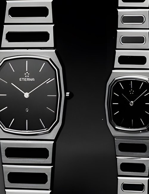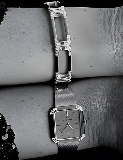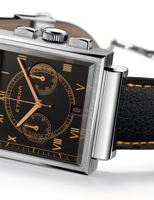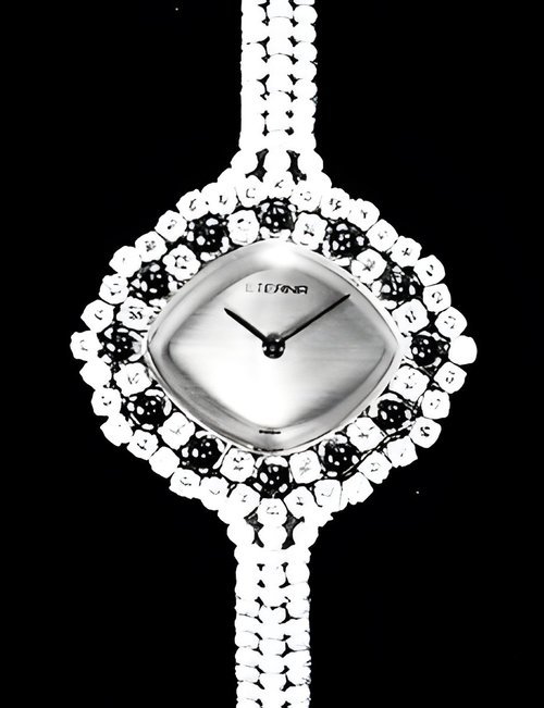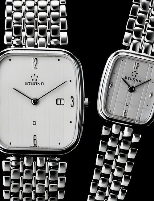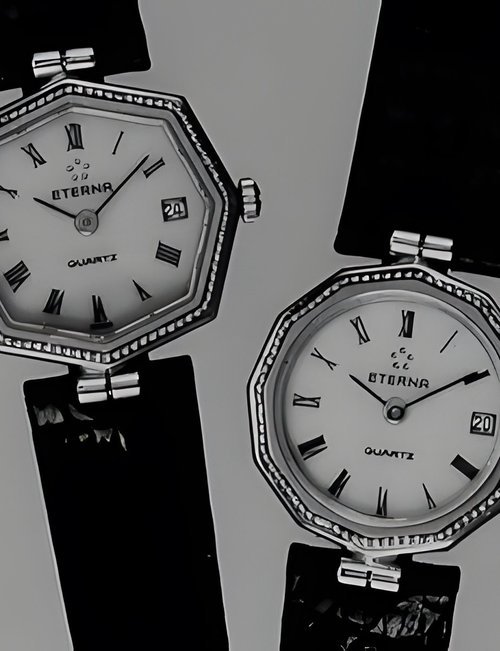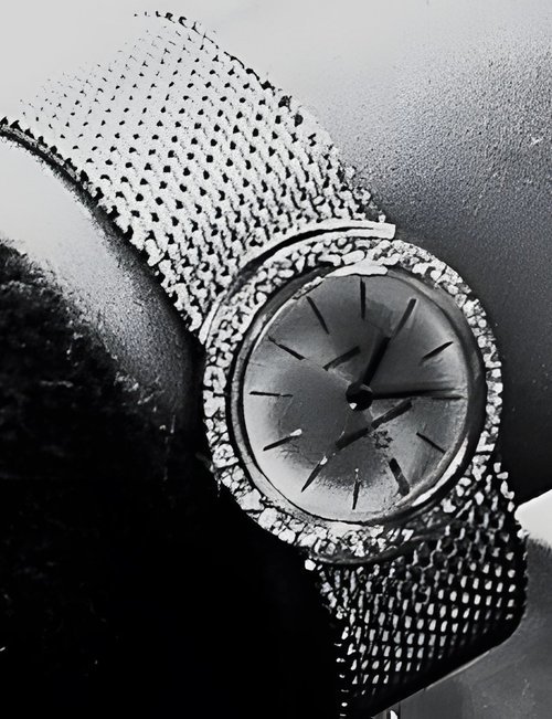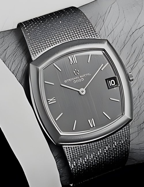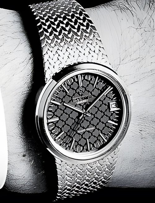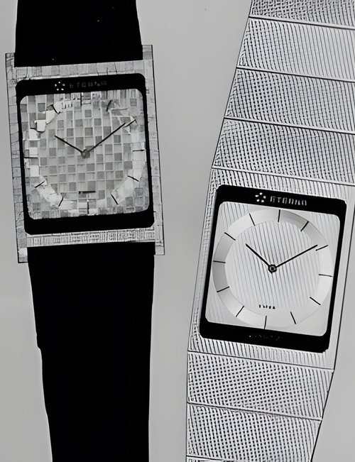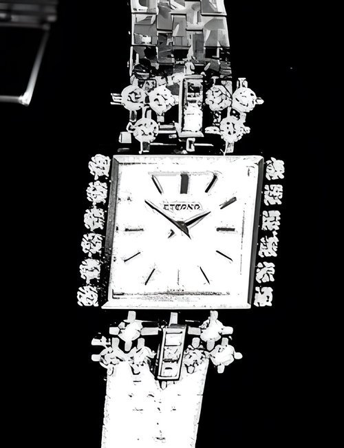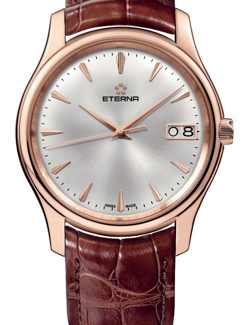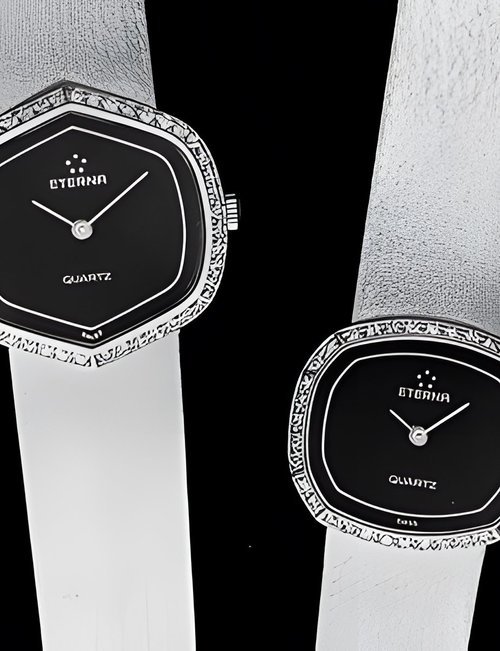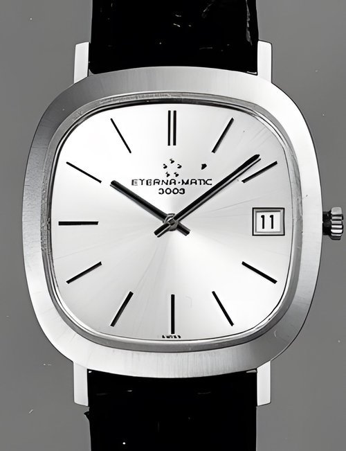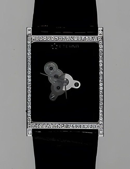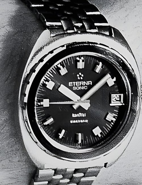 A splendid example of the “native gold” treatment , so much in the forefront of Switzerland’s watch styling at the present time. This jewellery watch is in l8ct yellow gold. The dial opening is in the "soft look’ styling, bt in the inverse sense - normally the case curves outwards. (ETERNA)