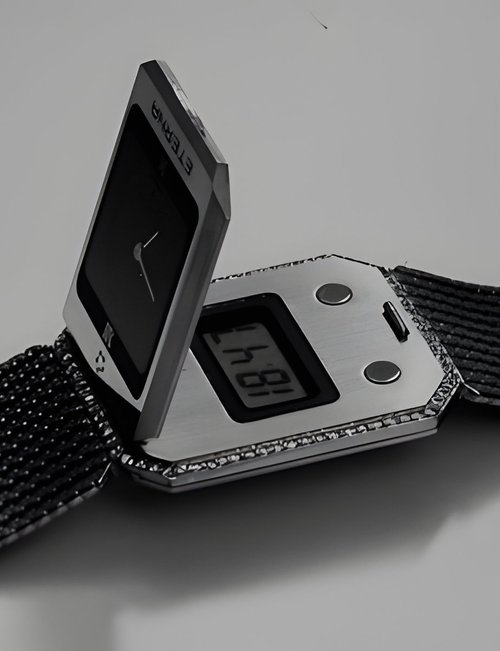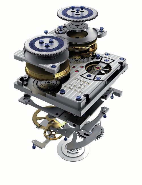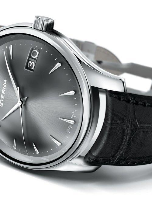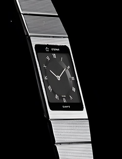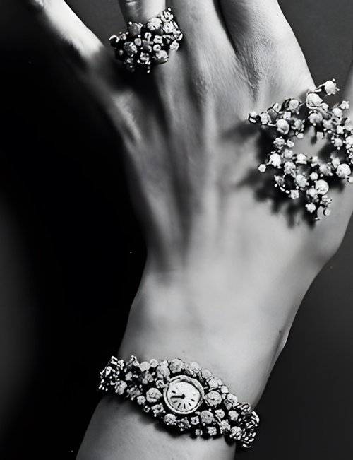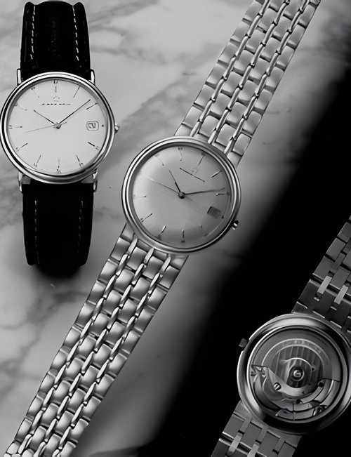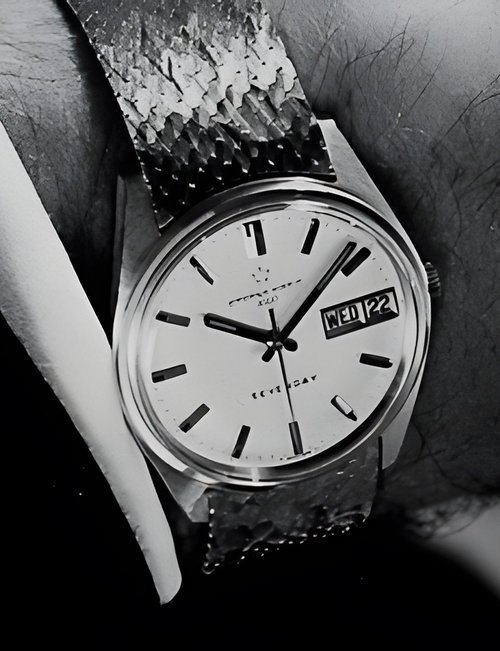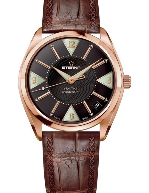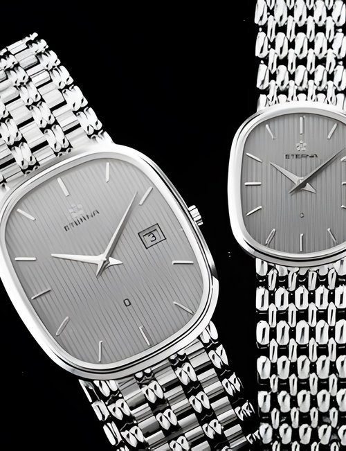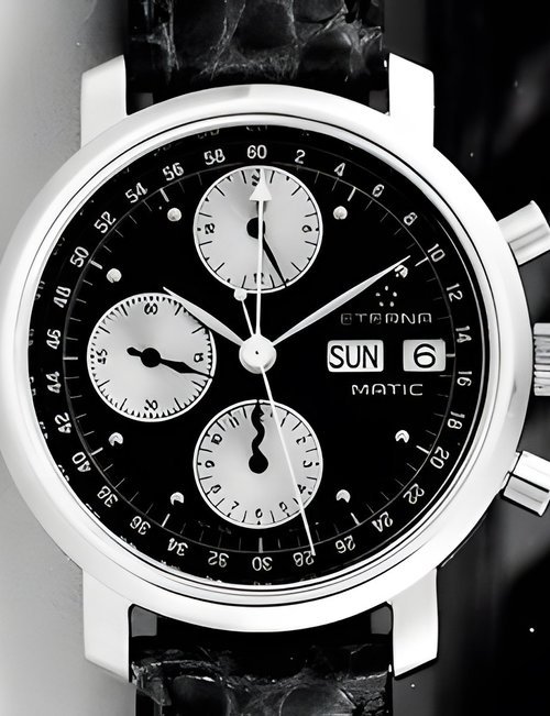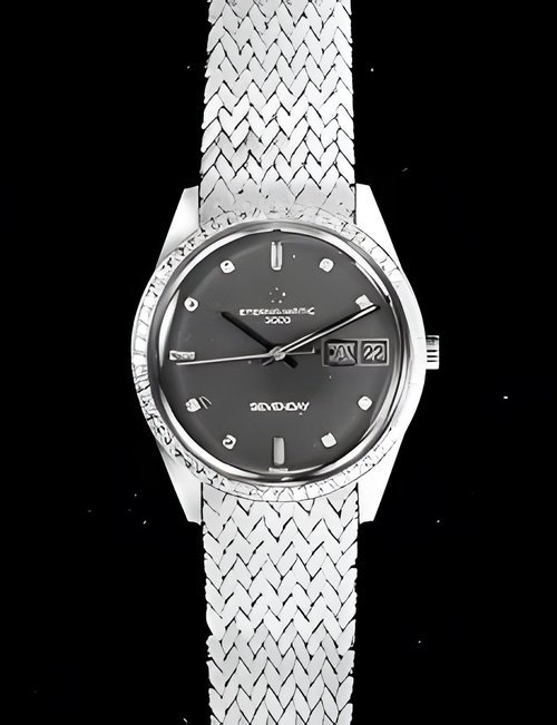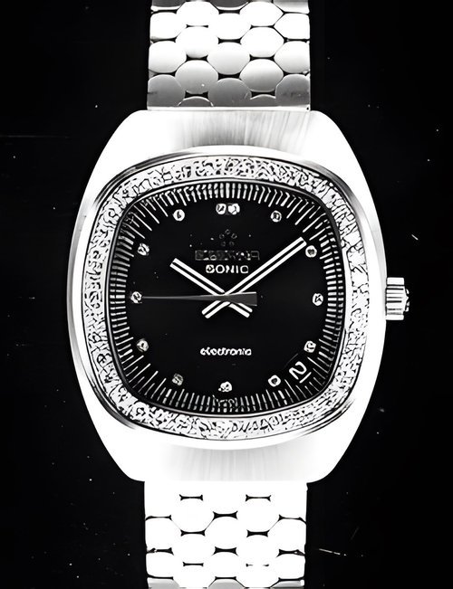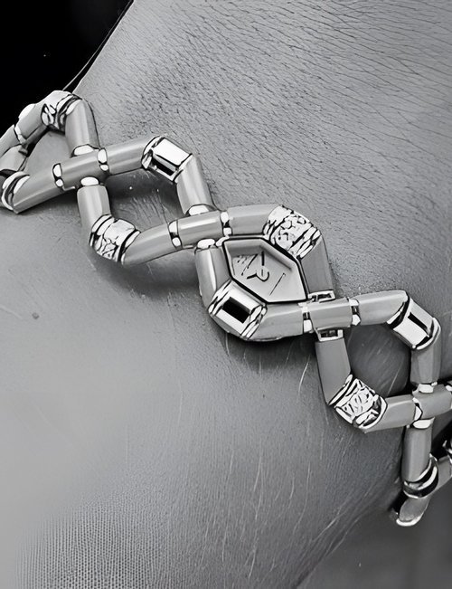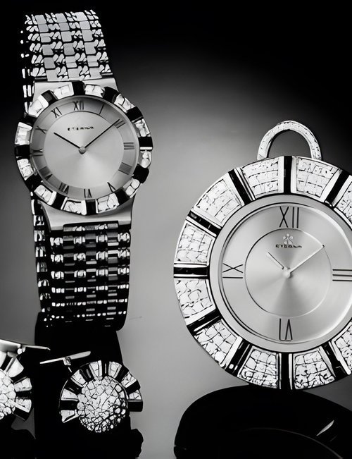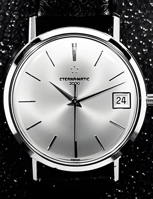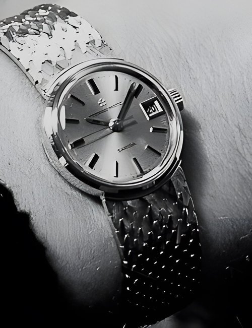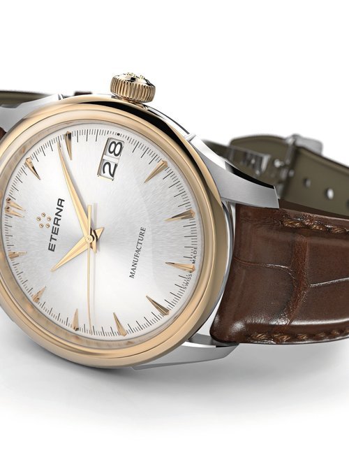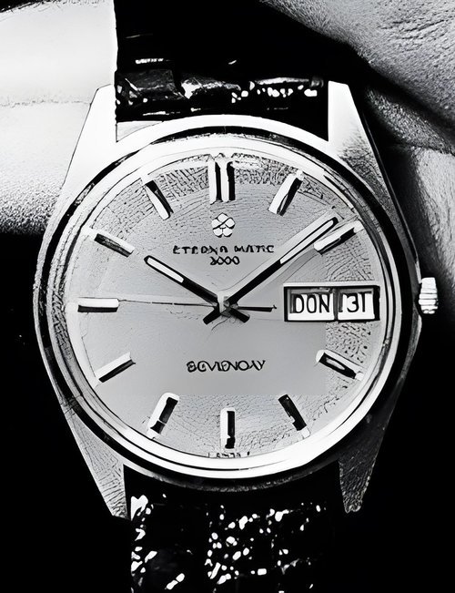 A splendid example of the “native gold” treatment , so much in the forefront of Switzerland’s watch styling at the present time. This jewellery watch is in l8ct yellow gold. The dial opening is in the "soft look’ styling, bt in the inverse sense - normally the case curves outwards. (ETERNA)