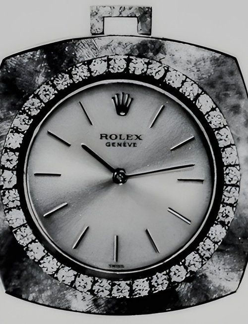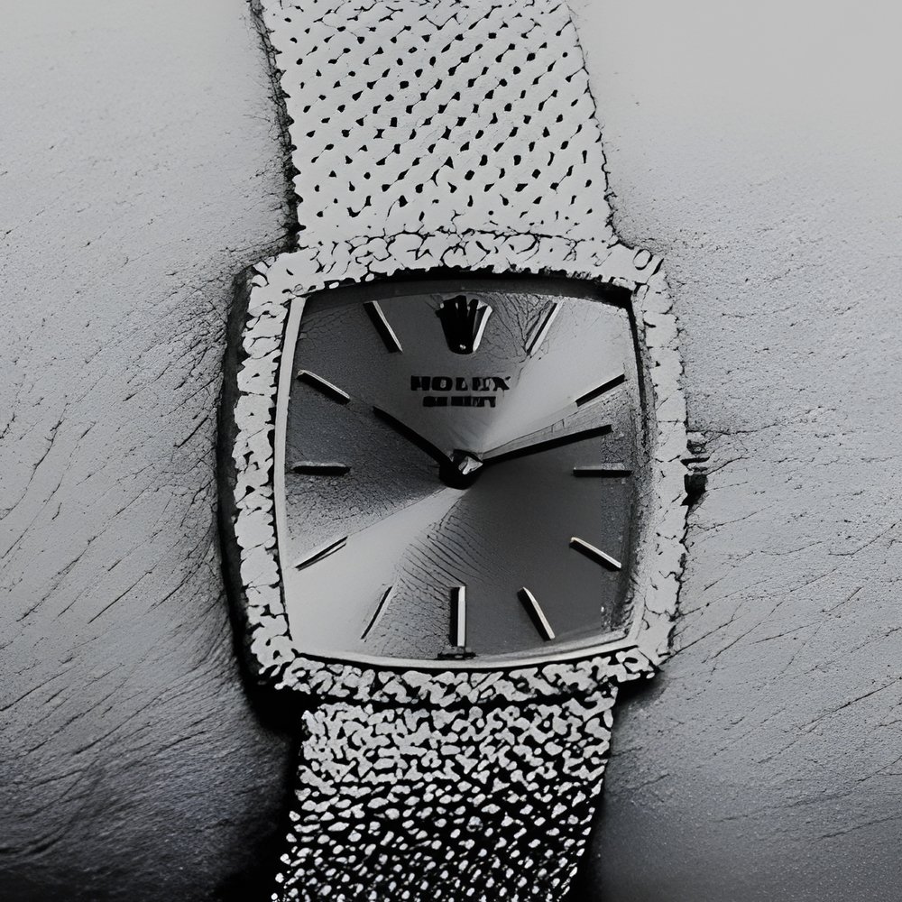 Today’s trend is to the large watch for ladies. This superb example in 1 8ct grey gold has a dial framed with diamonds. Note how the lines of the square case have been modified to give the new“soft look”. (ROLEX)