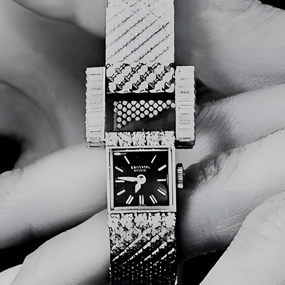 An appealing new way to fix a watch to a bracelet. The watch itself (in grey gold) has an “open clasp” type attachment which itself is treated as a decorative element. The watch itself has the up to date square look and is decorated with precious stones and baguette-cut diamonds. (UNIVERSAL)