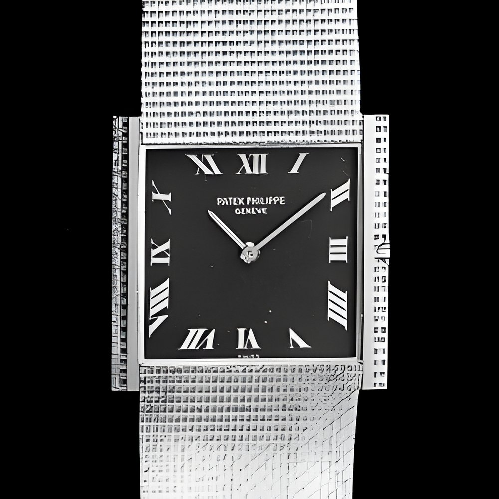 This man’ s watch is a fine example of the current "integral watch concept. Case and bracelet are in one piece In grey gold. Slatetextured dial. Note the remarkably fine engraving, so much in vogue today. (PATEK PHILIPPE)