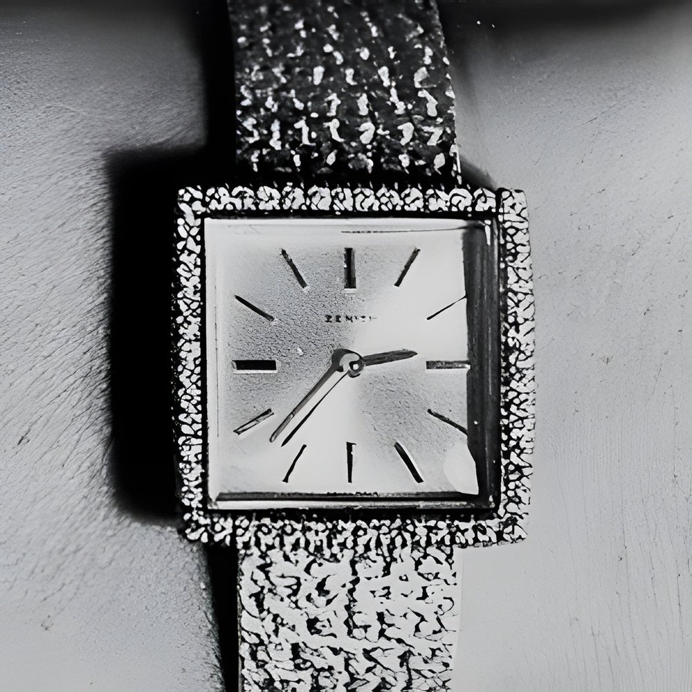 The, new trend to largor dimensions is evident in this handsome lady’s watch. Diamonds underline the sober case and a “tree bark” motif spans the largo 18 ct. gold bracelet. (ZENITH)