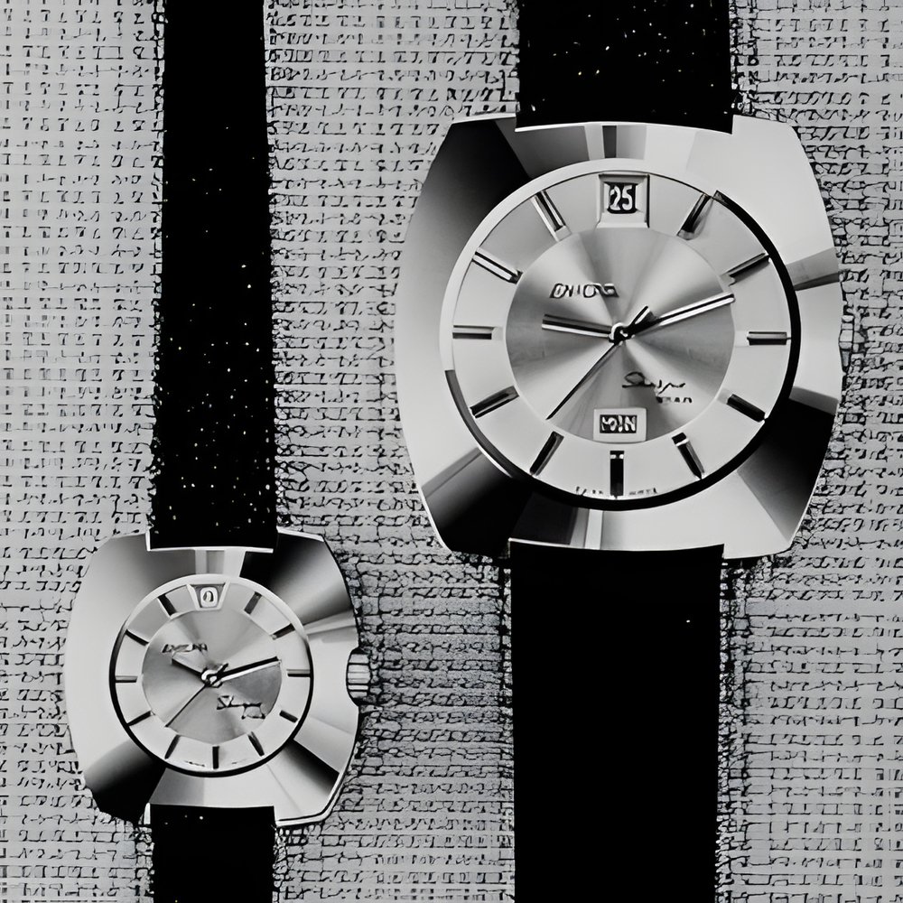 The sports watch cornos to “Nontros ot Bijoux” robed in “tonneau” lines, The hour markers are underlined in black. Automatic movemerit and calendar ; day-and-date on the man’s model. Stainless steel waterproof case. (ENICAR)