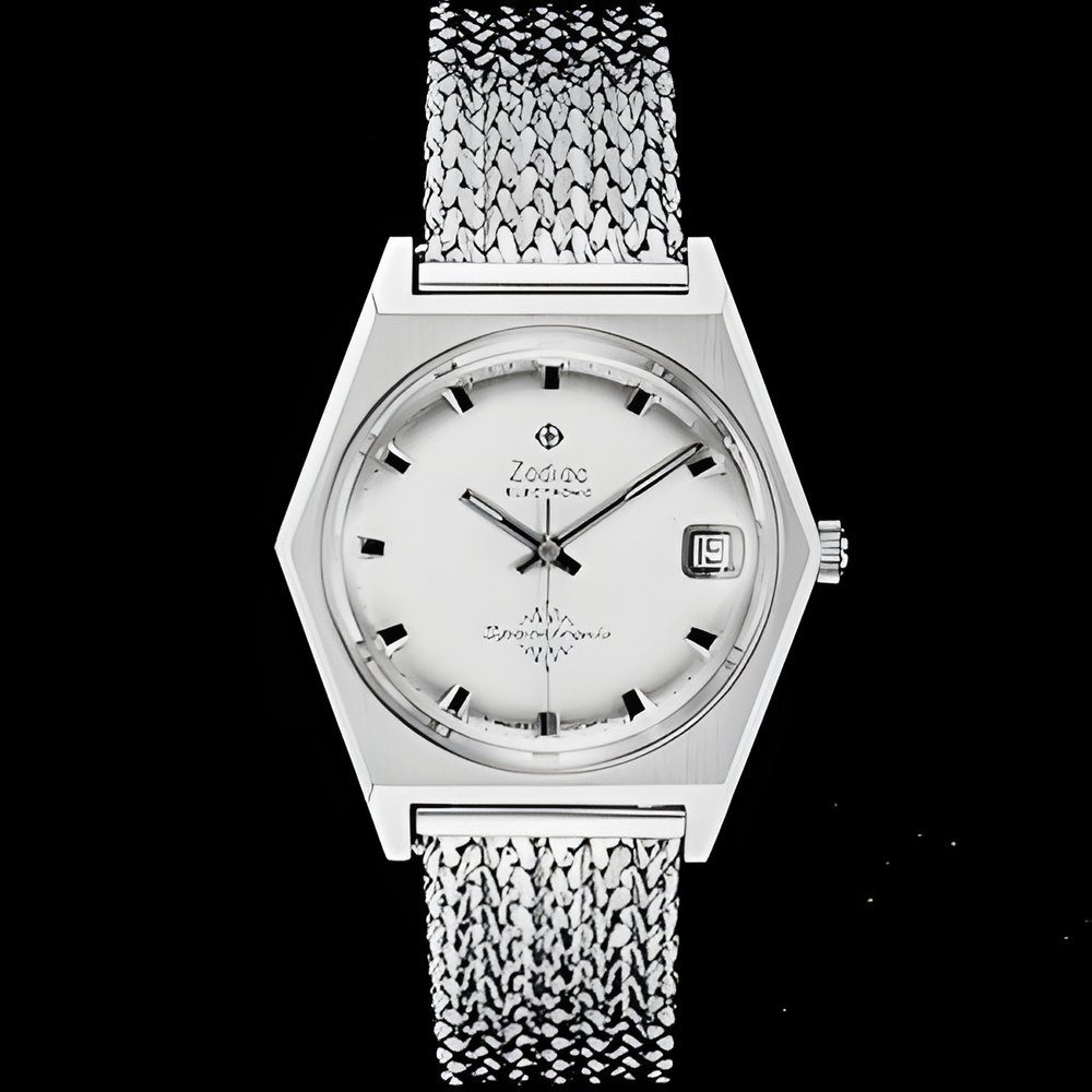 The “Montres et Bijoux” version of the “Spacetronic” electronic watch, this model comes in 13 carat gold. Hexagonal watertight case, with brushed bezel surface and. chamfered sides. The dial has applique markers with onyx-like incrustations . With calendar. (ZODIAC “Sracetronic”)