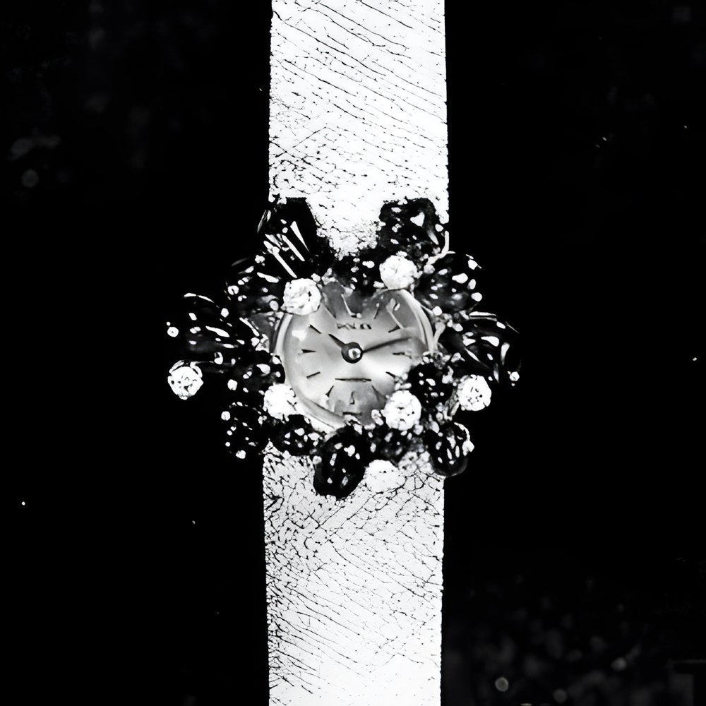 Jewellery-watch in 18 carat gold 14 cabochon sapphires (6-55 carats) among which nestle 7 brilliants , form an irregular cluster around the dial. (ROLEX)