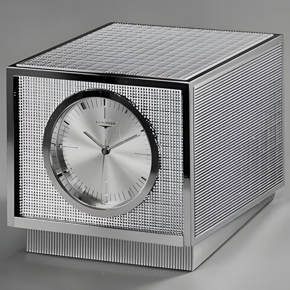A high-precision "timepiece : a ship’s chronometer in executive suite styling. Its electronic quartz movement is precise to a few thousandths of a second per day. It can be used as a master clock. (LONGINES)