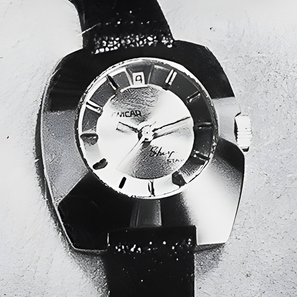 The, sports watch comes to “Montres et Bijoux” robad in “tonnoau” lines. The noir markers are underlined in black. Automatic movement and calendar. Stainless steel, water-proof case. (ENICAR)