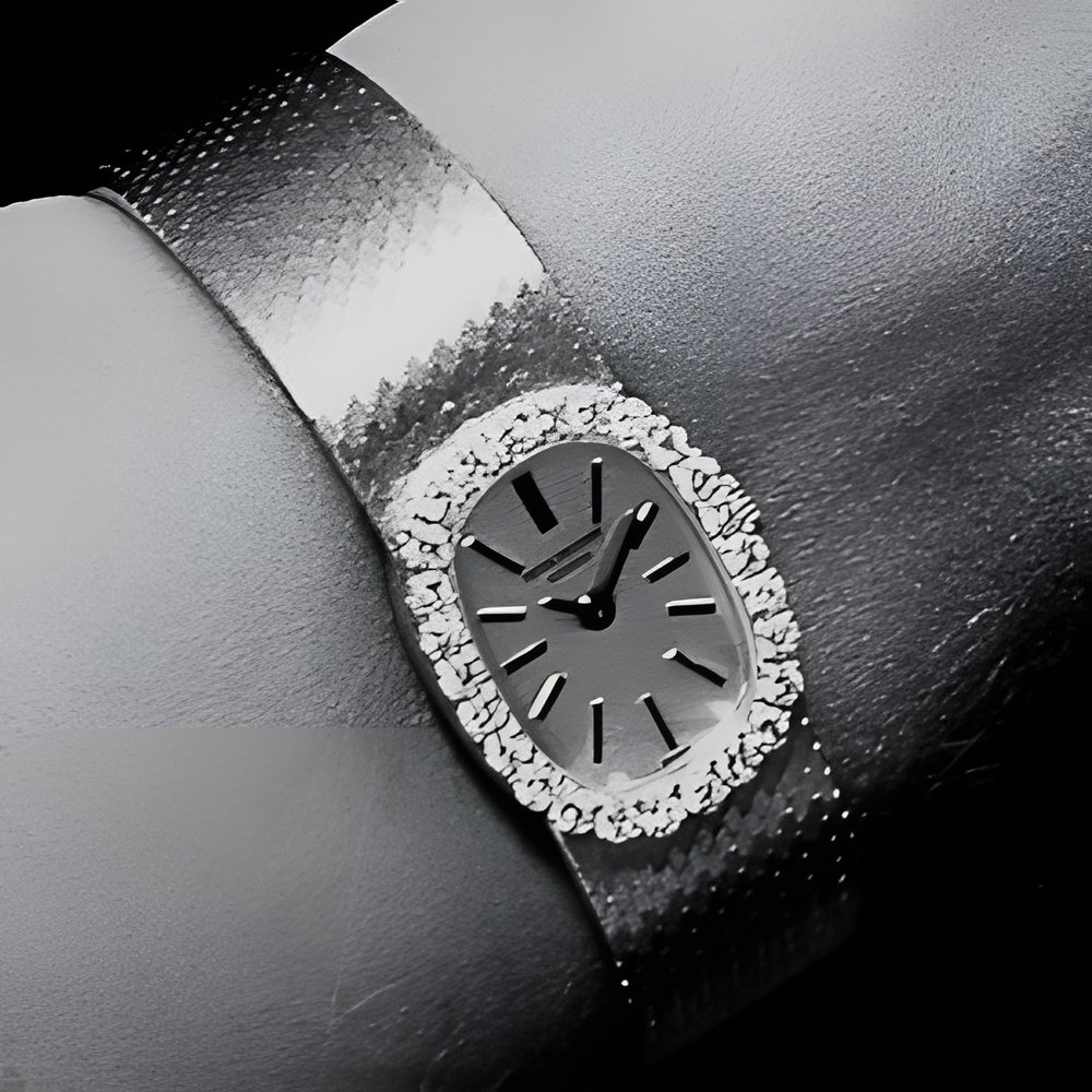 The “Ellipse d’or” line neither oval nor quite “tonneau” shaped . This jowellery-watch is in grey gold and a row of diamonds accentuato tho shape of the case, ínto which the bracelet flows directly, in “integral watch” fashion. (PATEK PHILIPPE)