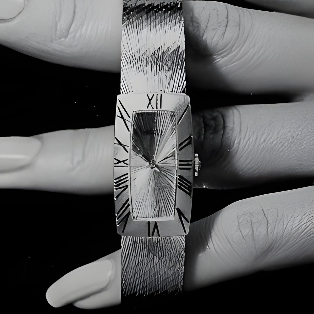 Boldly styled, this “tonneauI”-line watch - unveiled at “Montres et Bijoux 1967” - possesses a large yellow gold bezel contrasting with the grey gold of the dial and bracelet. Roman figures are strongly etched on its surface. Note the sunray motif on the dial continuing on the bracelet which gracefully blends into the case. (BOREL)