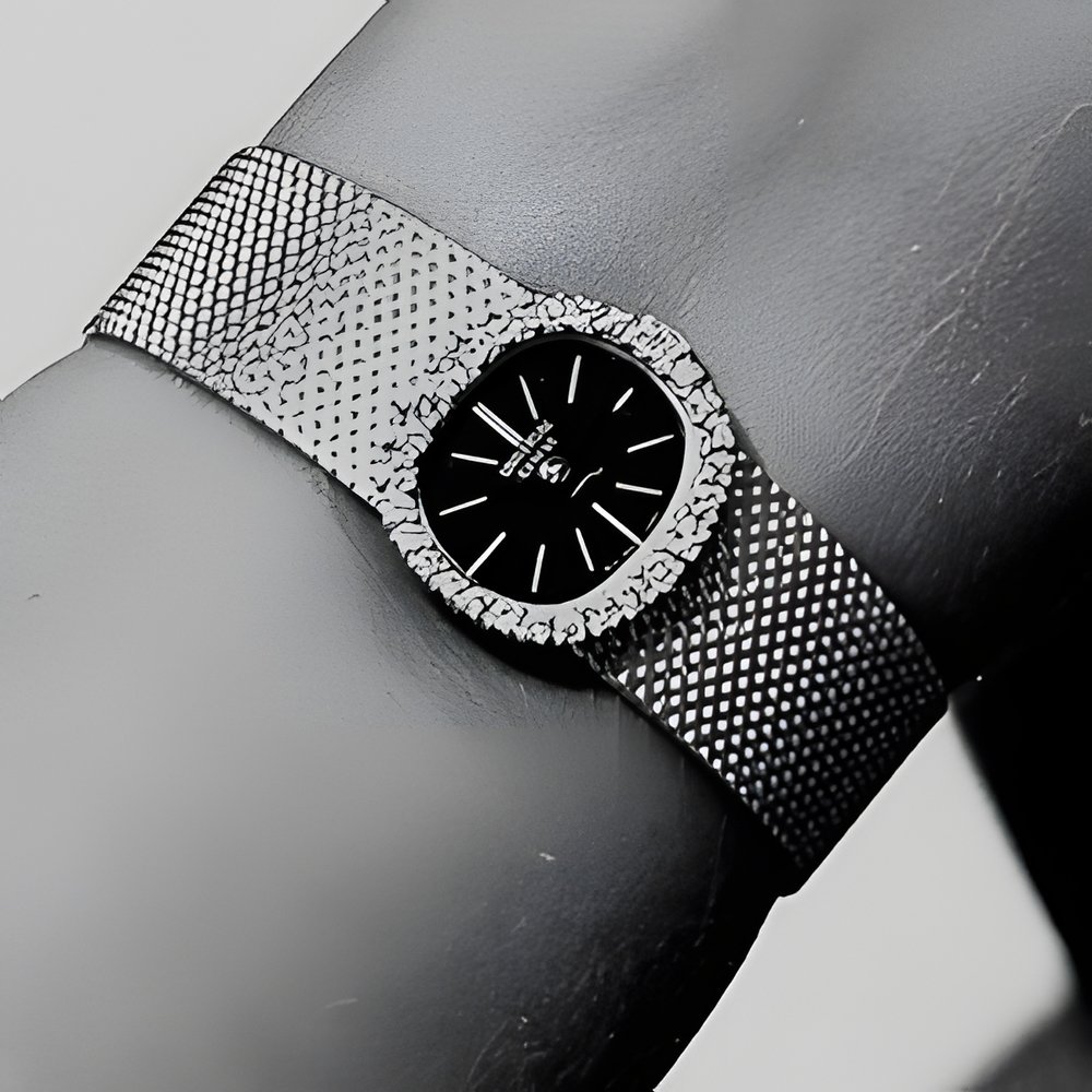Eliptical, neither oval nor quite “tonneau”-shaped describes the lines of this jewellery-watch. The wide, grey gold bracelet runs gracefully into the case set with a row of brilliants Slate-grey dial. (UNIVERSAL)