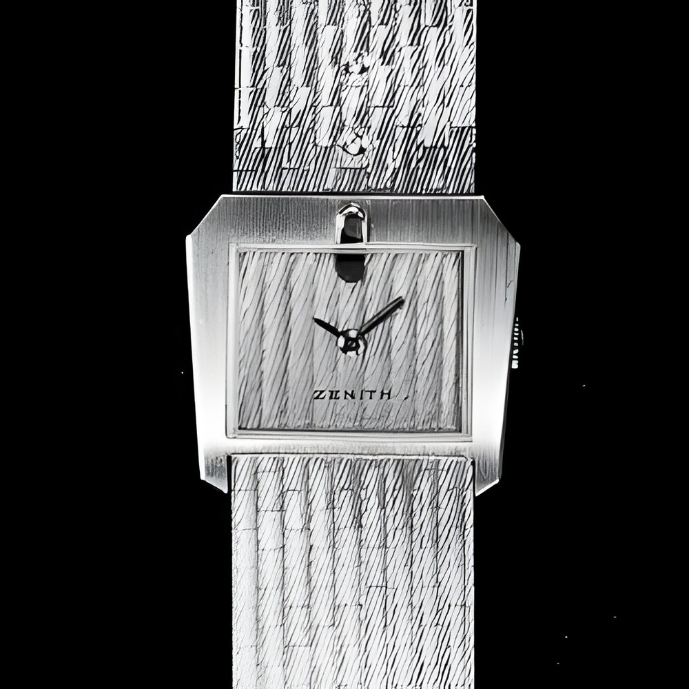 A wristwatch with highly original styling. The yellow gold case is shaped like a buckled This theme is accentuated by the white gold bracelet and dial, both engraved with the same motif arid seemingly one unit. (ZENITH)