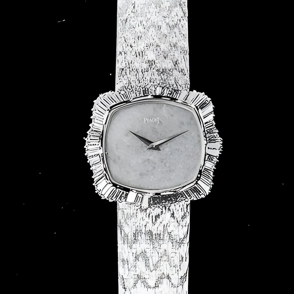 Softly curving angles are a striking feature of this large, ultra-thin ladies’ watch in 1 8 carat white gold. 52 individually-cut baguette diamonds (6.12 carats) frame the opal dial. The fine-link bracelet is completely engraved. (PIAGET)
