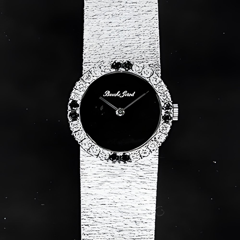 The fashion expression is blue on this jewellery—watch. Blue, the romantic colour of the dial, a lapis lazuli plaque, and of the sapphires inserted between the brilliant-cut diamonds which rim the case. Engraved 18 carat white gold bracelet. (BUECHE-GIROD)