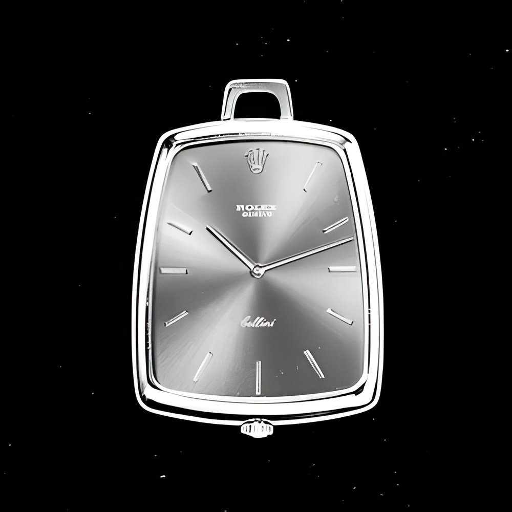 Rounded lines are in style. Here is a “pear” shaped pocket watch. Angles have been mellowed into soft lines, even on the sides. Elephant grey dial, baton markers. In 18 carat white gold. (ROLEX)
