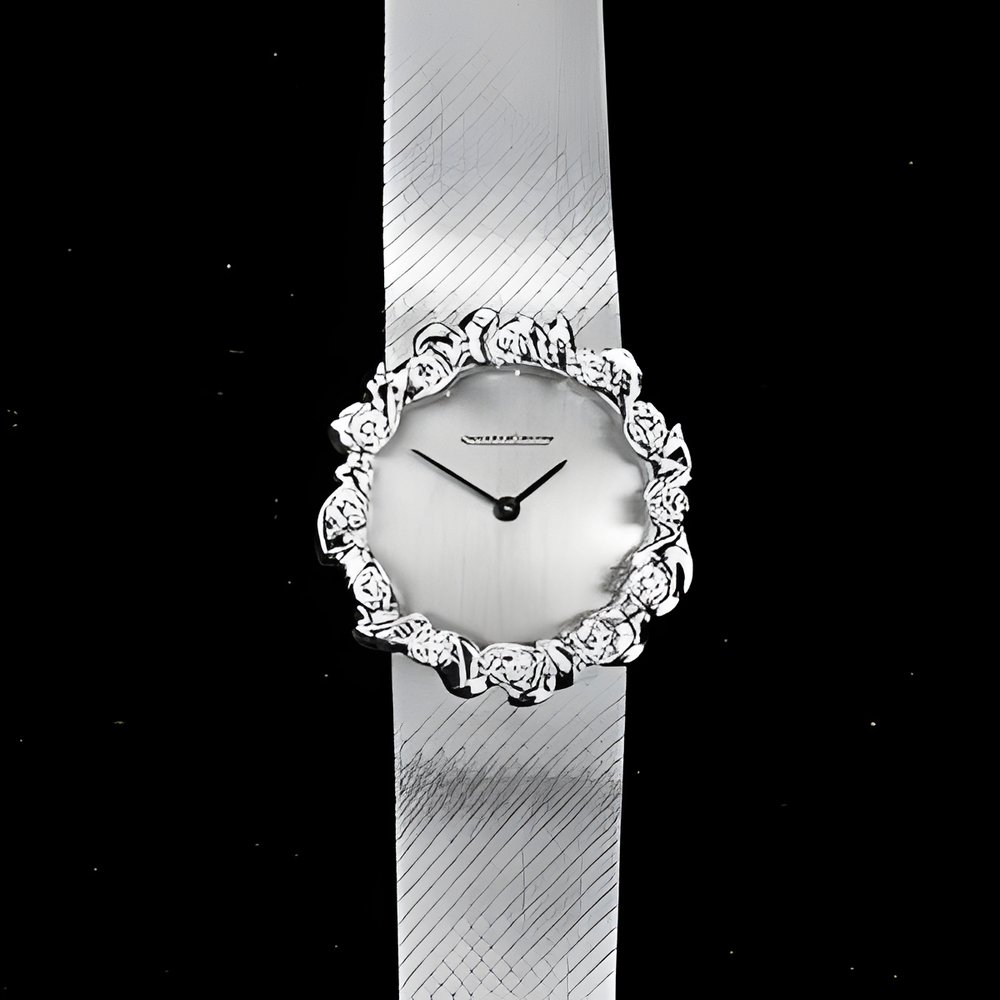 Diamonds set in the polished white gold frame circling the dial, mark the hours of this striking jewellery-watch. An impression of continuity results from the same surface texture found on the rhodium-plated dial and the bracelet, also in white gold. Extra-flat mouvement. (JAEGER-LECOULTRE)