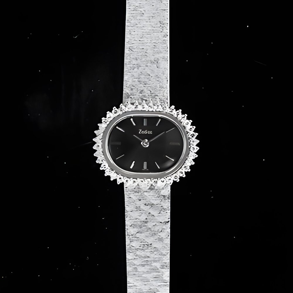 This jewellery-watch is a perfect example of the widened oval, one of the outstanding silhouettes of today’s fashion mood. In white gold, it is also noteworthy for the “claw” setting of the diamonds which rim the case. Grey-blue dial. (ZODIAC)