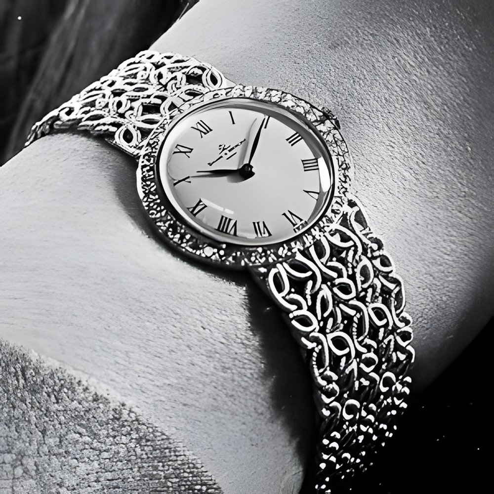Interlaced links and fine engraving work give this model its romantic note. Brilliants ring the round case. The dial bears Roman numerals. Case and dial in 18 carat white gold. (BAUME & MERCIER)