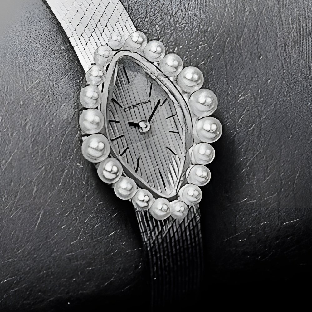 The discreet lines of this watch give it a distinctly romantic air. The rounded lozenge of the case is underlined by a crown of real pearls, carefully chosen to accentuate its lines. The decor of the 18 carat yellow gold bracelet also graces the dial. (CERTINA)
