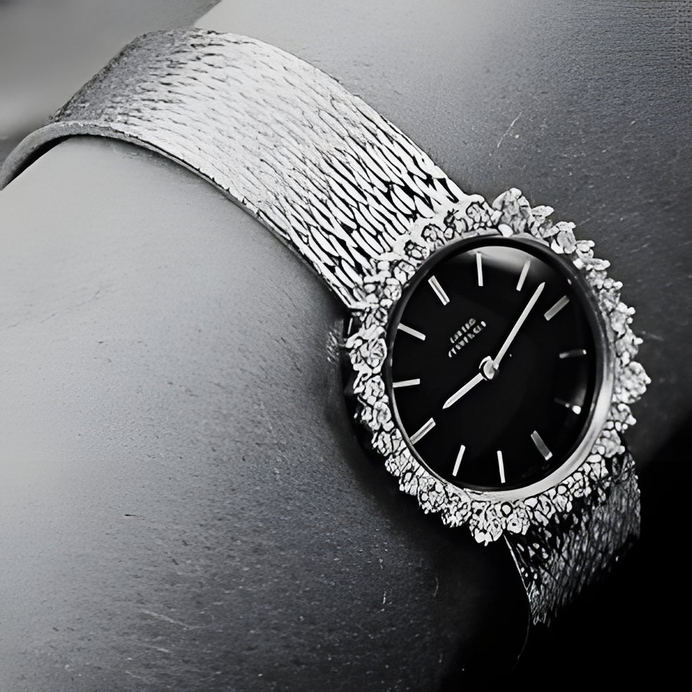 The four large diamonds set into the ci-own of brilliants which rims the dial are this watch t most striking feature. Its charm also resides in the contrast between the black dial and the soft gleam of its finely chased 18 carat white gold bracelet, (GIRARD-PERREGAUX)