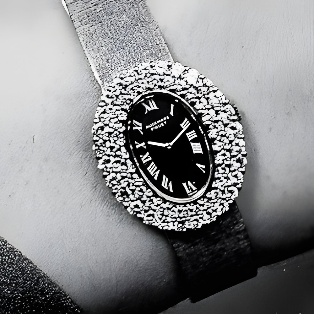 This jewellery-watch, in 18 carat white gold, displays all the elegance of the “oval line”. Brilliant-cut diamonds in an off-set pattern widen the oval rim of the grey dial, inscribed with Roman numerals. The claws of the setting add to the model ? s character by interspersing white gold among the bril iiants0 (AUDEMARS PIGUET)