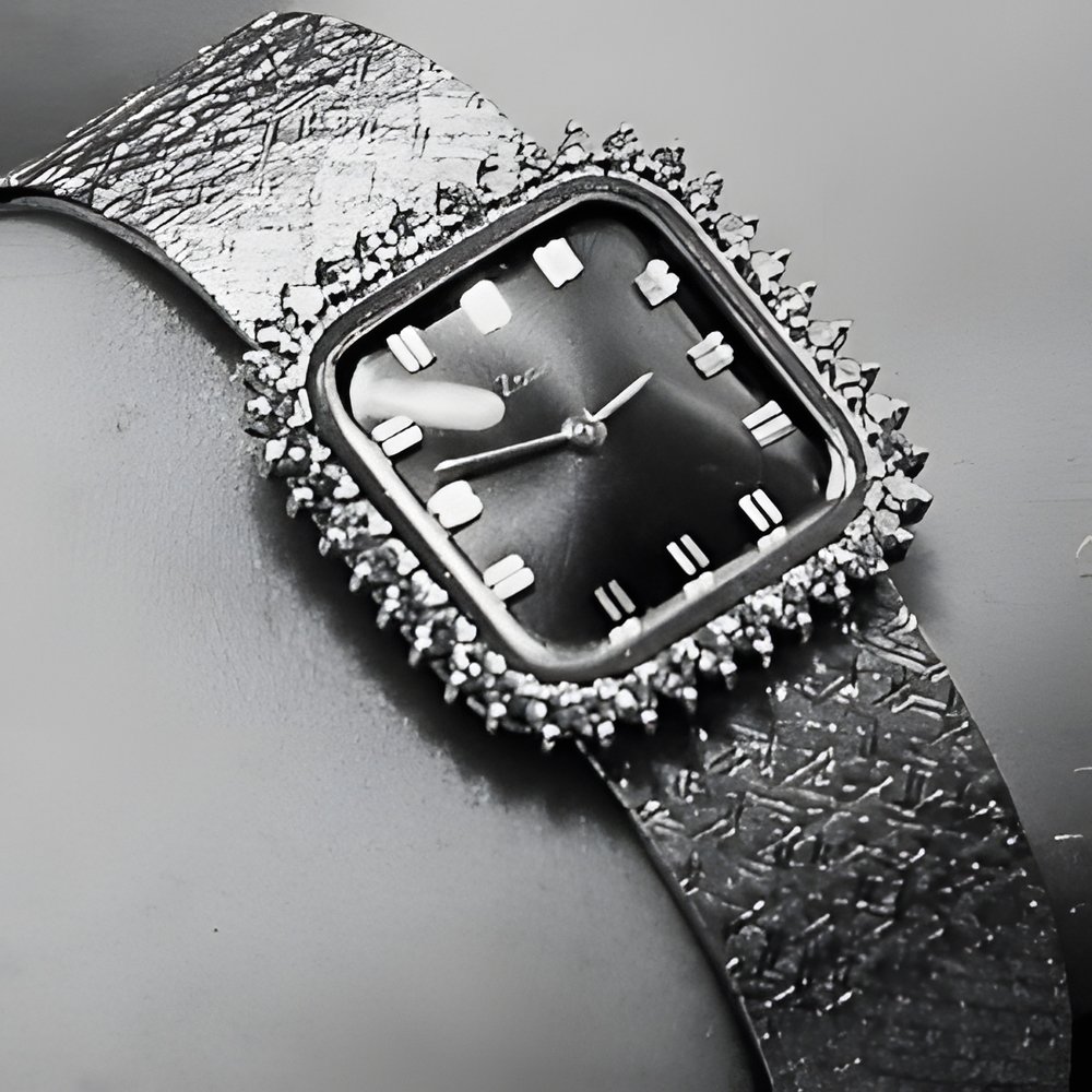 t ’Montres et Bijoux“, even the square has softened its angles. A row of brilliant-cut diamonds is placed around the case, the”claw" setting providing this model with its striking individuality. Dark blue dial with raised facetted studs. in 1B carat white gold. (ZODIAC)