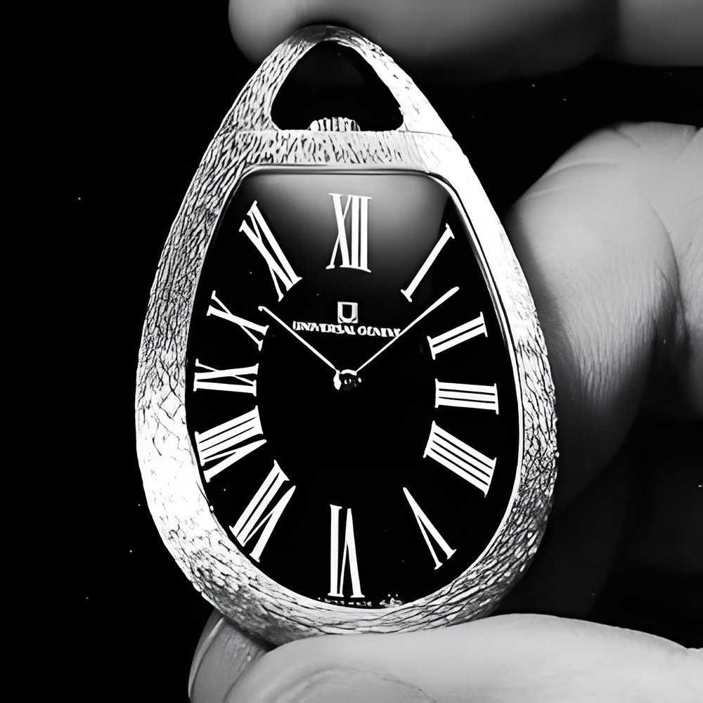 A pocket watch in 18 carat white gold for formal and evening wear. Extremely thin, pear shaped, it is covered with fine engraving work. Navy blue dial with Roman numerals. . (UNIVERSAL)