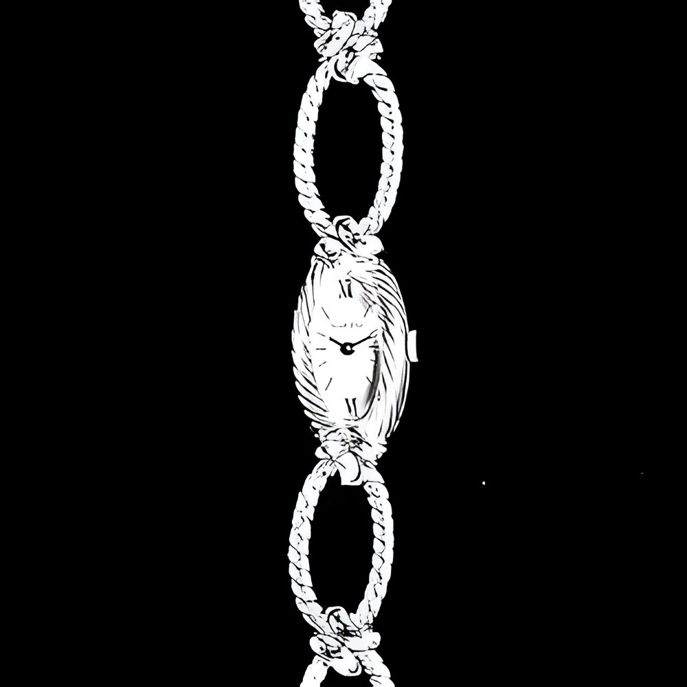 Large links, so fashionable today, held together by dainty romantic motifs. The watch is lodged in a navette shoped case, completely engraved. In 18 ct yellow gold with gilt dial. (BUECHE-GIROD)