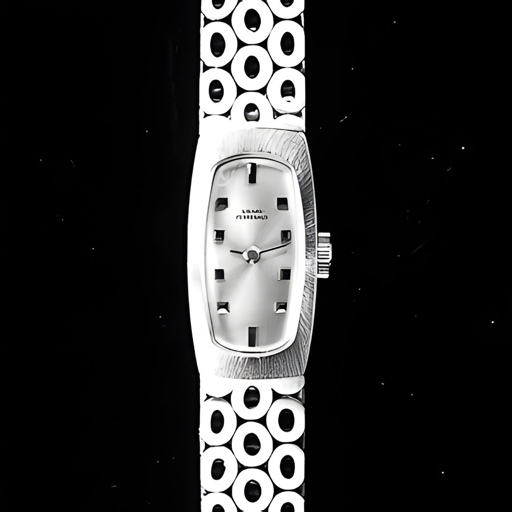 A dainty ladies’ model in 18 ct white gold. Its bracelet achieves perfect integration with the "tonneau shape case. Made up of a number of small links, the bracelet is very much in keeping with recent styling ideas. (GIRARD-PERREGAUX)