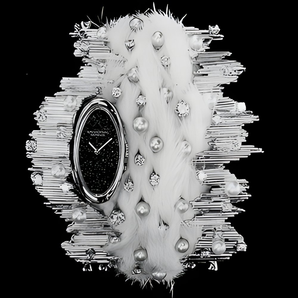 A highly original creation weds white and yellow gold to royal io This “armband” model is worn high on the wrist. Its entire surface is studded with brillants and Pakistan pearls. The watch itself is lodged in an elongated oval case (actually a double oval line) and has a night-blue nuit. (UNIVERSAL)