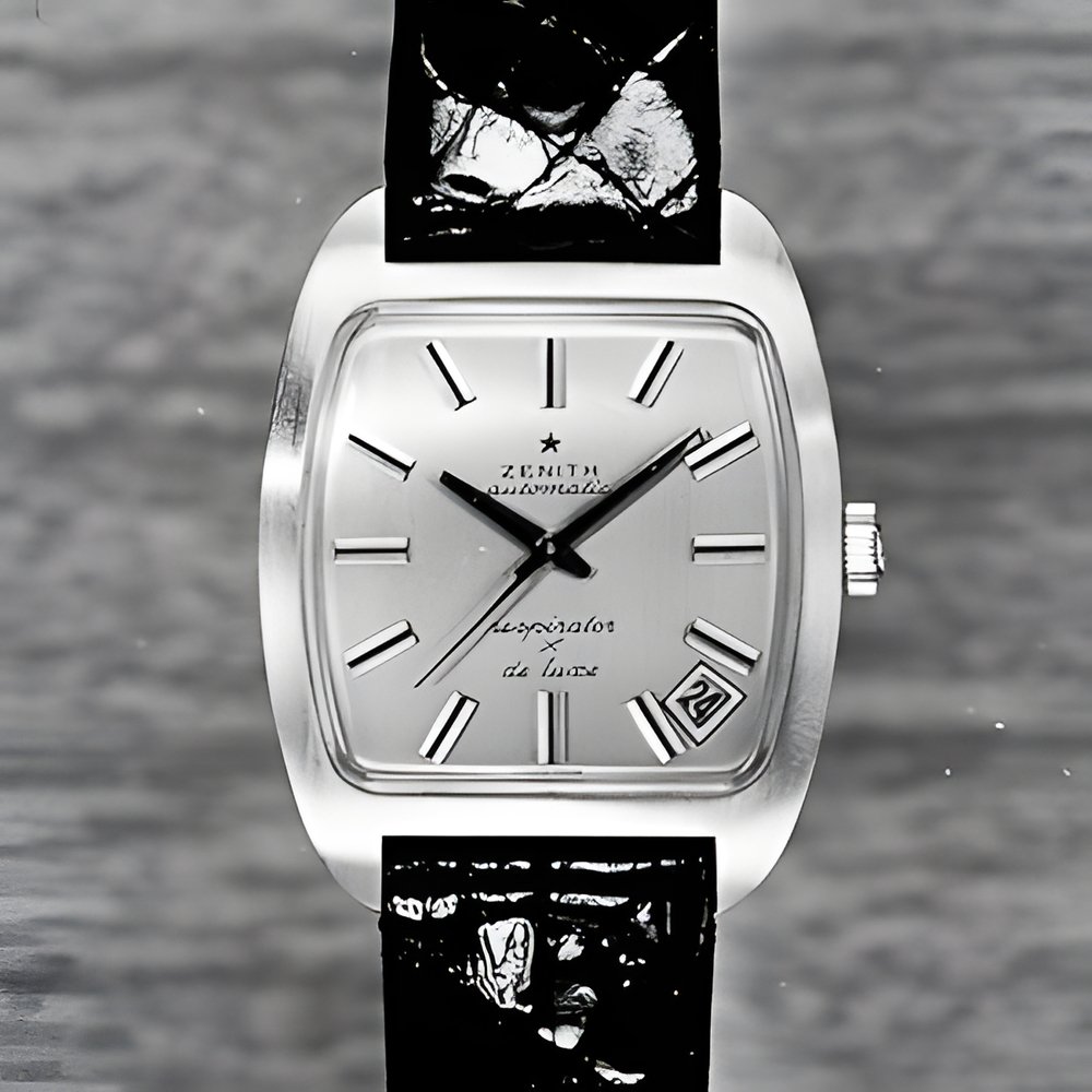 The yellow gold casé of this man’ s automatic watch has gracefully cambered square lines. The applied hour markers are stressed by an onyx inlay. Calendar. (ZENITH)