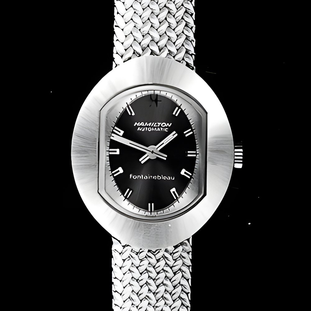 Combining rounded and straight lines, this model is very representative of present-day fashion in watches. It is in 18 ct white gold and has a smoked brown dial. (HAMILTON)