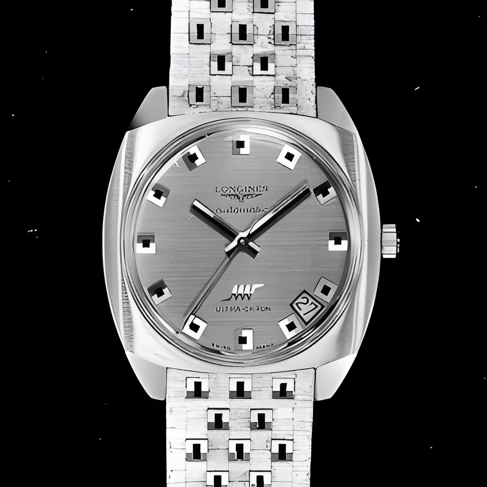 This model’s modernistic case lines clearly show the present trend to the combination of square and circle. The bracelet pattern, onyx-inlaid square studs, repeats that of the dial. High frequency automatic movement, calendar. In 18 ct yellow gold. (LONGINES)