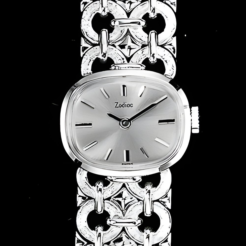 Bracelets made of rings and links are the rage. Here is a variation on this theme, presented in 18 ct yellow gold. The watch caso is an eloquent example of the recent trend toward wedding “shaped” and round lines. This result is achieved here by combining two ellipses. (ZODIAC)
