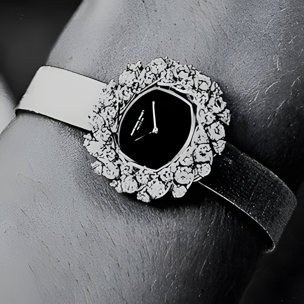 A jewellery watch notable for the way the diamonds are set “around” the case. The setting is so perfect that the crown of 40 diamonds seems to be wrapped around the case. The lapis lazuli dial combines straight and curved lines in the new style in fashion today. (AUDEMARS PIGUET)