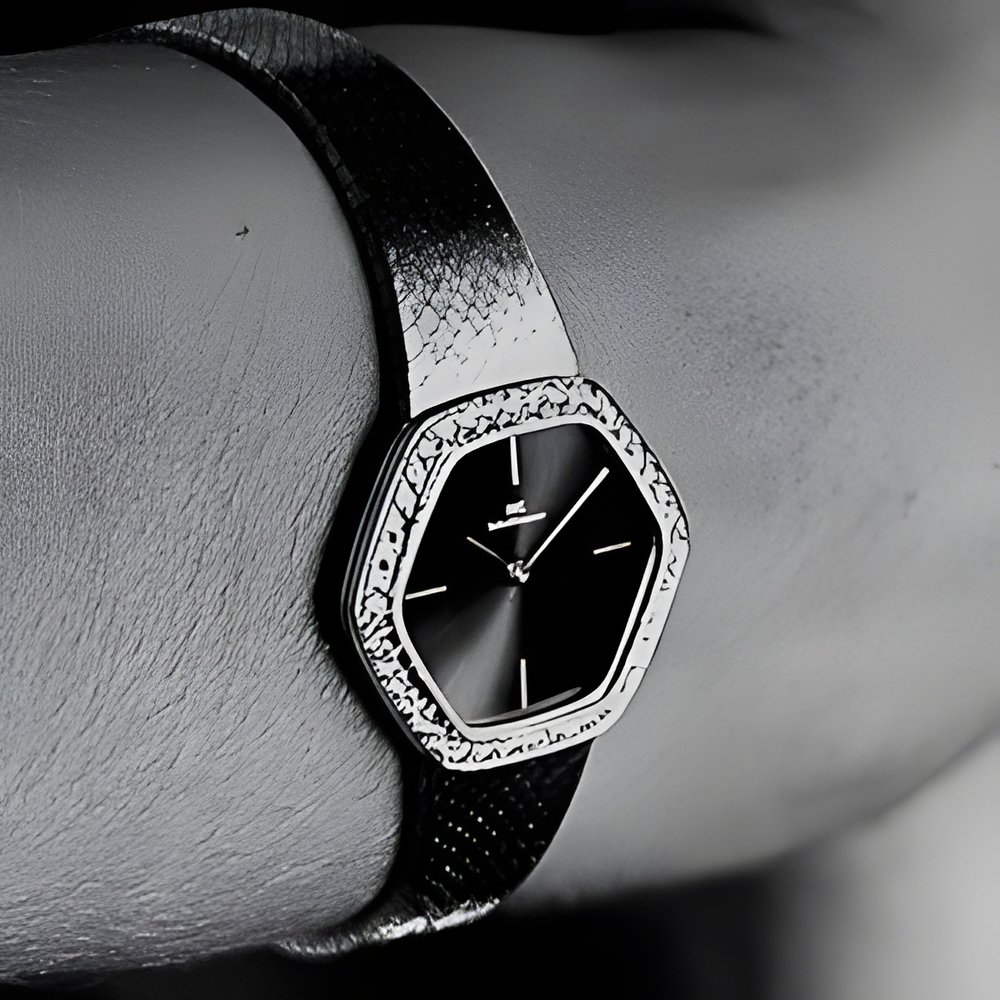 A typical example of the basic watch fashion trend revealed at “Montres et Bijoux”. The hexagonal dial has subtly rounded contours, in a happy compromise between angle and curve. The blue dial enhances the fires of the brilliants which frame it. In 18 ot white gold. (INTERNATIONAL WATCH CO., IWC)