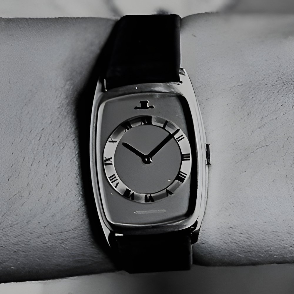 An eloquent arid handsome demonstration of the new fashion in watch styling. The circle bearing the Roman numerals is placed inside a slightly rounded rectangular cases The dial has a velvety brown background and the case is yellow gold. (JAEGER-LECOULTRE)