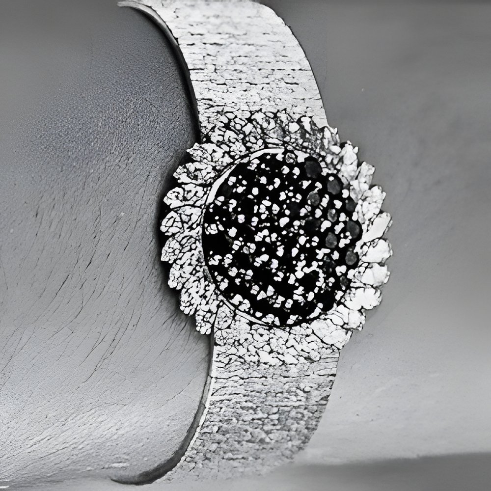 The ever-imaginative art of watch design is perfectly embodied in this tasteful jewellery watch. A crown of 28 navette-cut diamonds (3-98 carats) frames a coverlid itself studded with 38 sapphires (5-56 carats) hiding the dial. In 18 ct white gold. (PIAGET)