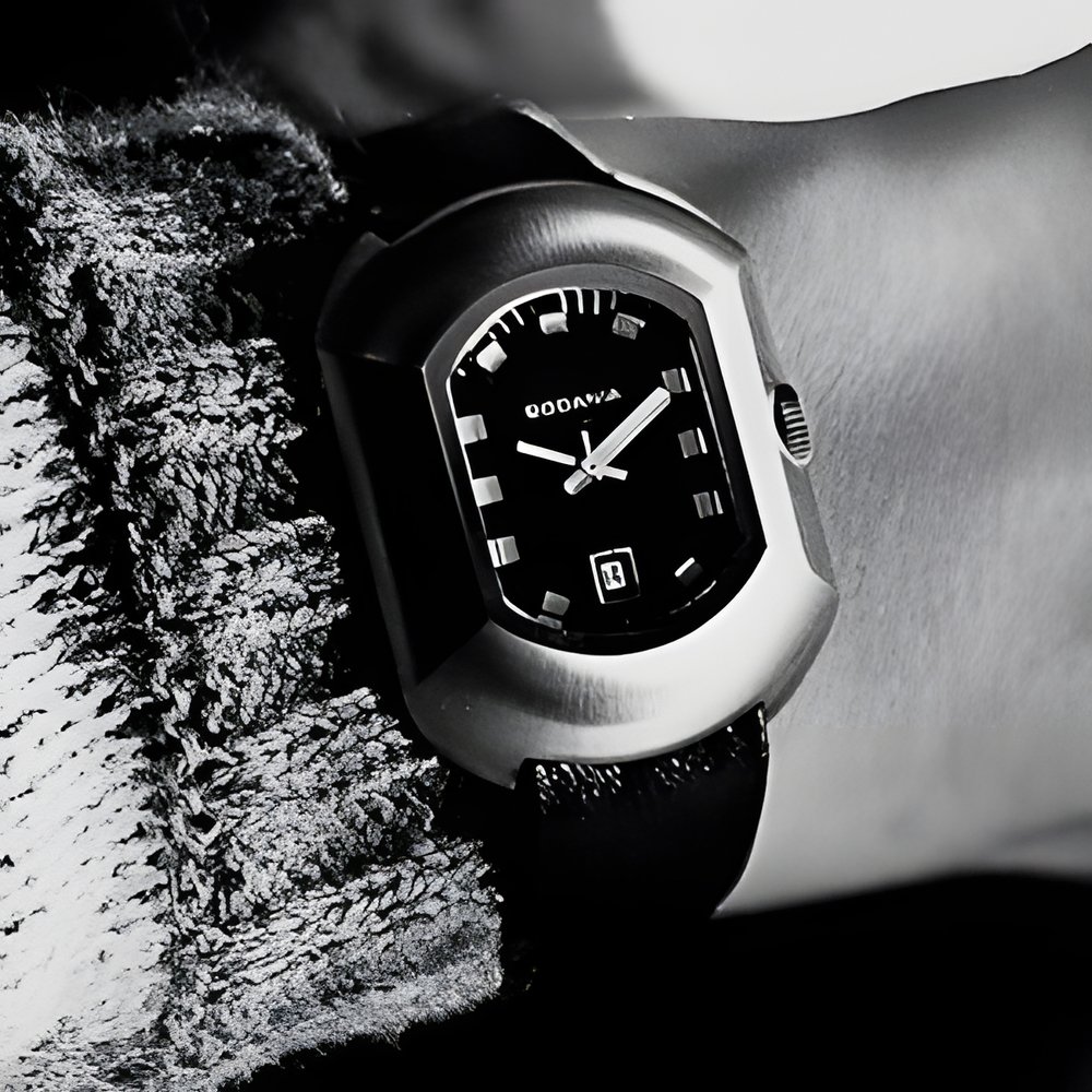 A “tonneau” line case hides this model’s automatic movement. This watch is a typical example of the recent trend to the association of straight and rounded lines. Blue or dark green dial. Calendar. (RODANIA)
