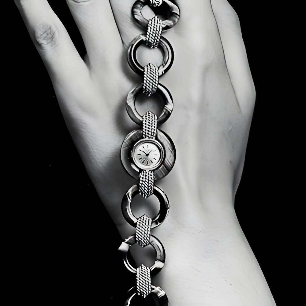 The large-link bracelet of this evening watch is typical of current horological fashion. The links are unusual in that they are made of precious stone like the case itself, they are carved from a solid piece of tiger’s eye. The links between these are in 18 ct yellow gold. (VACHERON & CONSTANTIN)