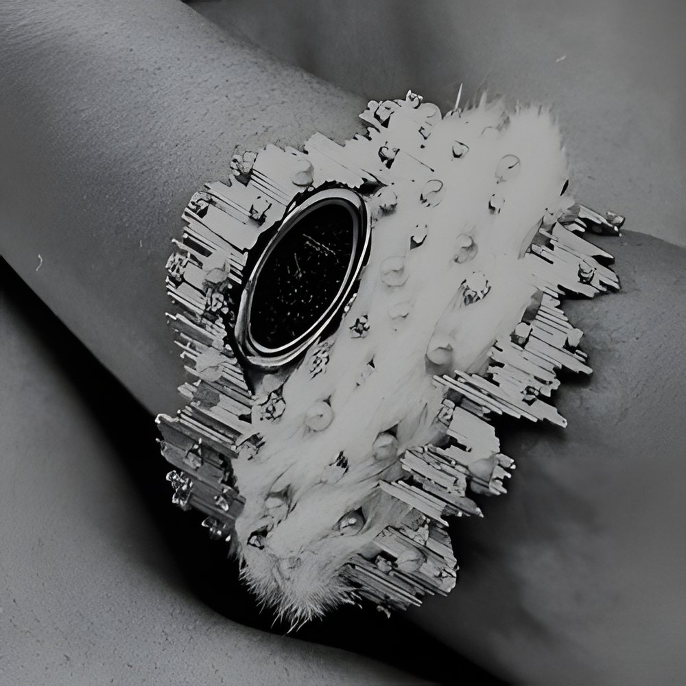 A highly original creation weds white and yellow gold to royal io This “armband” model is worn high on the wrist. Its entire surface is studded with brillants and Pakistan pearls The watch itself is lodged in an elongated oval case (actually a double oval line) and has a night-blue dial. (UNIVERSAL)