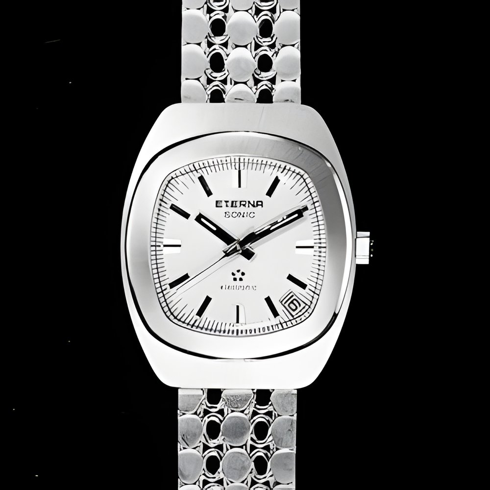 An ologantly styled man’s electronic watch. This model is an example of the “composite shape”, with the stress on curved lines The bracelet is of the openwork type, combining small plaques and open links The electronic movement has a sonic resonator with a vibration rato of 300 per In 18 carat yellow gold with white gold bezel. Calendar. (ETERNA “Sonic”)