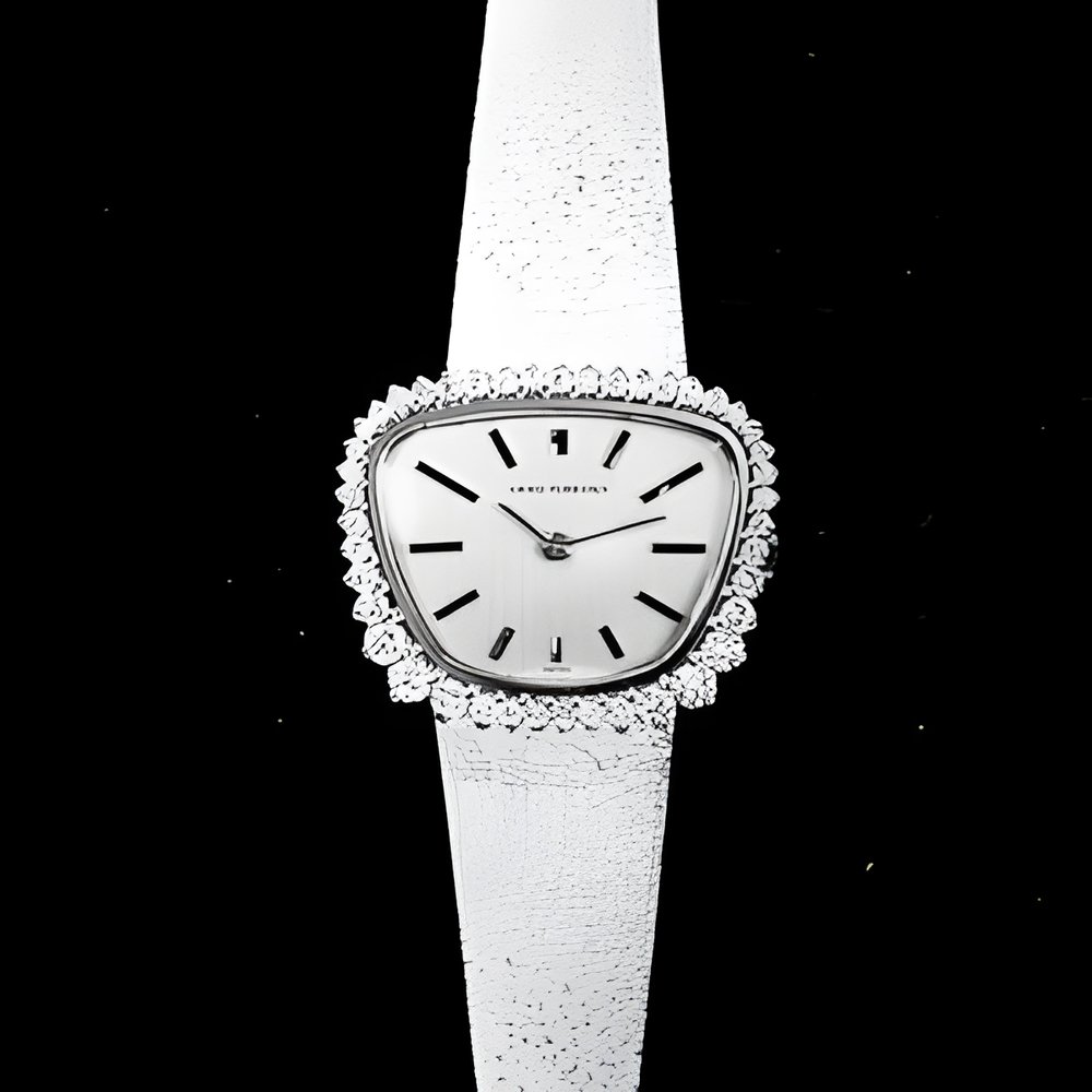 A shield-shaped dial stressed by a battlement of 43 diamonds handsomely set off by their “sphere-tipped” setting. Note their progressively larger size towards the sides of the watch. Taperedline bracelet in 18 carat white gold. (GIRARD-PERREGAUX)