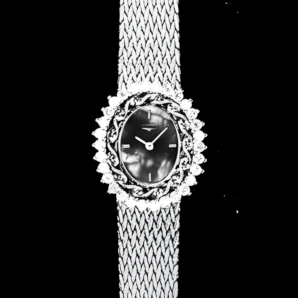 The oval remains the classical line. This jewellery-watch’s dial, a thin slab of mother-of-pearl, is framed by a torsaded white gold motif set with brilliants, itself surrounded by a rim of brilliants with a “sphere-tipped” setting for added ornamental impact Delicate white gold bracelet. (LONGINES)