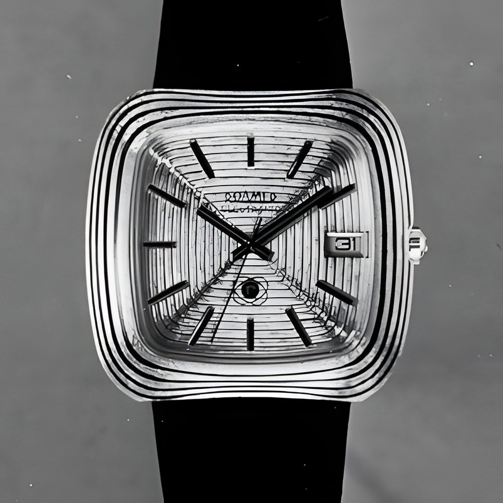 A man’s electronic watch with concentric-line decor. Starting on the bezel, this motif continues on the dial, giving an overall effect of depth. In 18 carat yollow gold. (ROAMER)