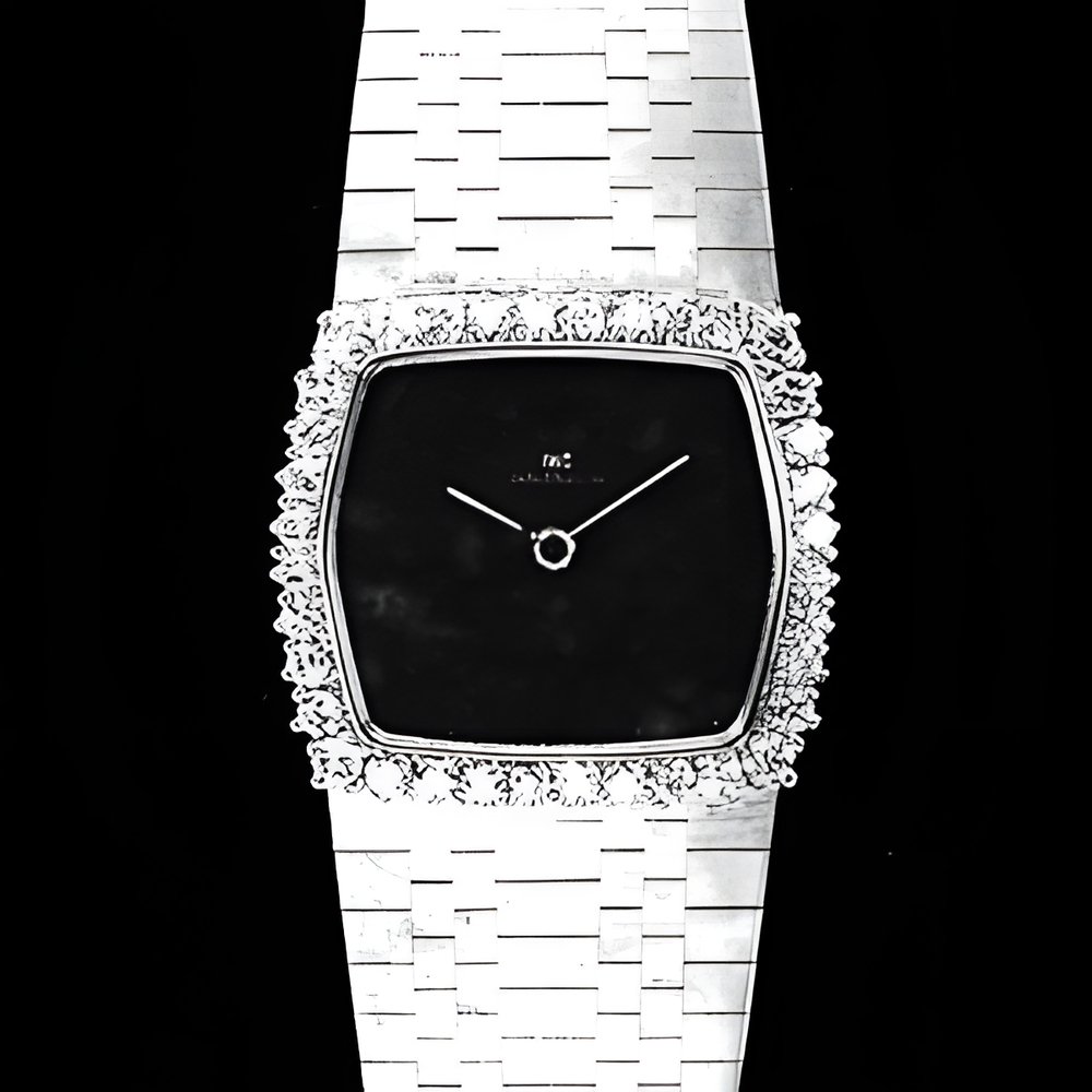 This watch displays perfect integration of bracelet and case. A thin jade plaque marks the dial, set off by a row of brilliants. The bracelet is constituttd by a host of smoothly meshing small 18 carat white gold slabs (IWC - International Watch Co.)