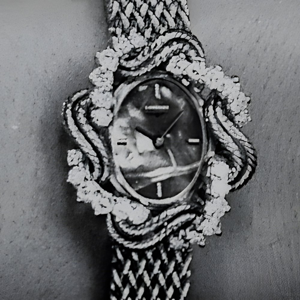 A moth er-of-pearl dial is this jewellery-watch’s outstanding characteristic It is surrounded by a white gold torsaded motif set with four rows of six brilliants each The finely fashioned 18 carat white gold bracelet is notable for its oxtrmo supplenes. (LONGINES)
