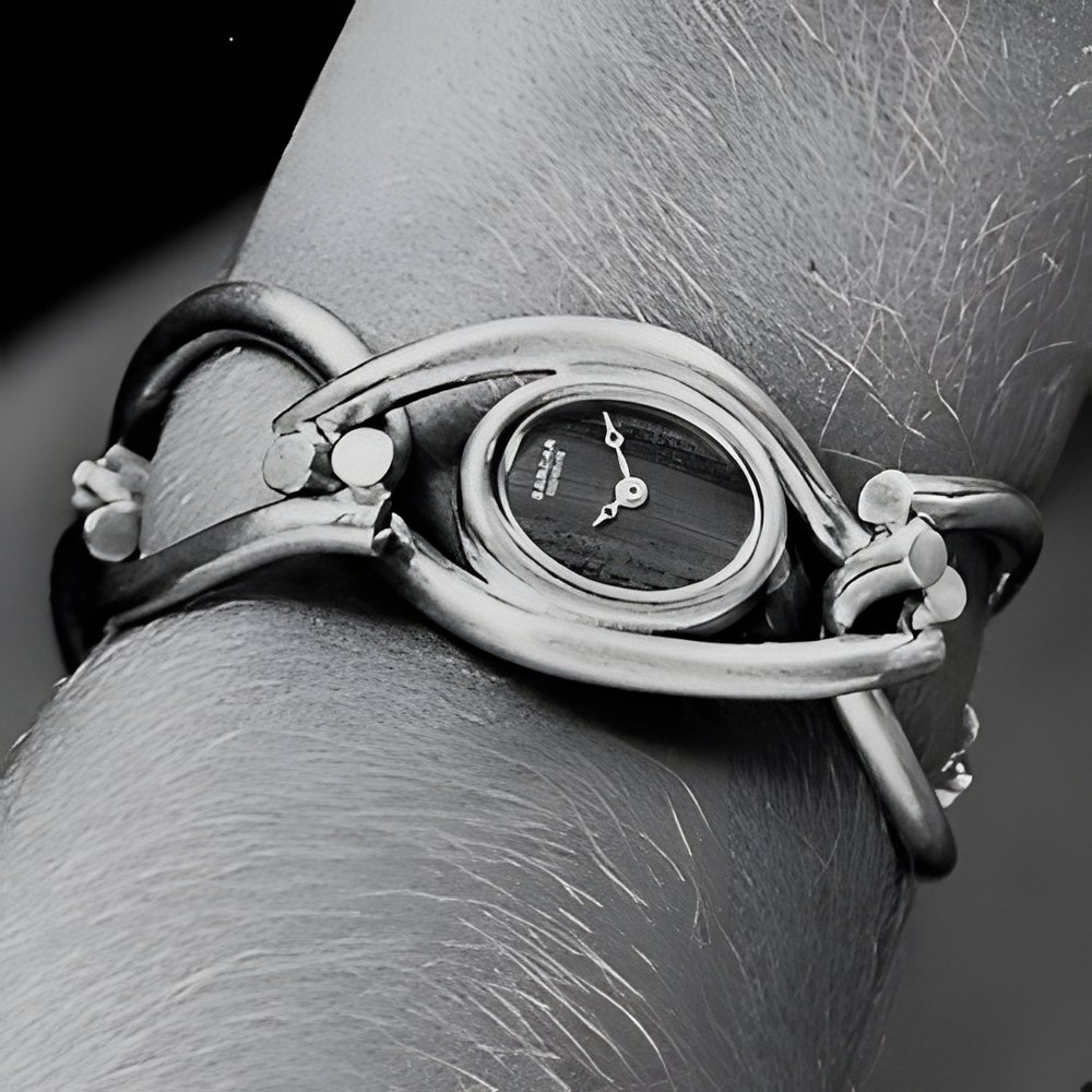 Large links, yet styling unity remains complete. One of the matt-finished silver links houses the watch without breaking the bracelet’s continuity. The dial is a slice of turquoise, (SARCAR “Silver Rose Collection”)